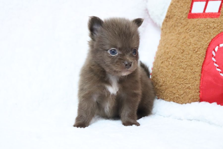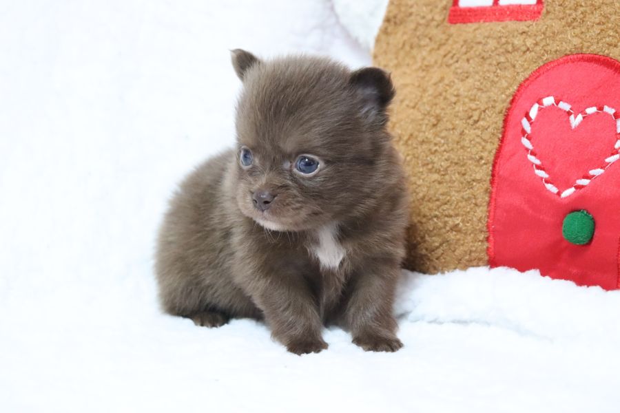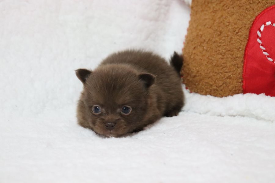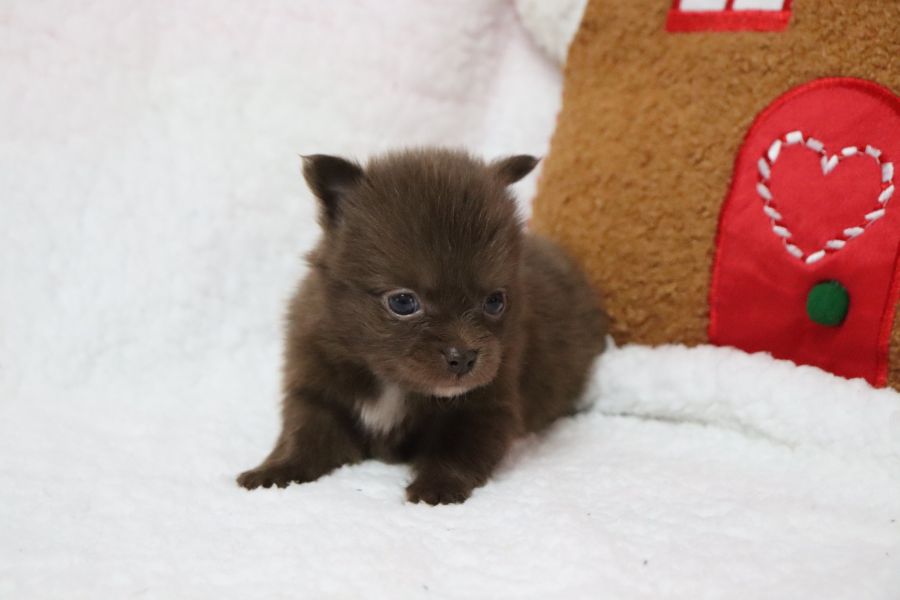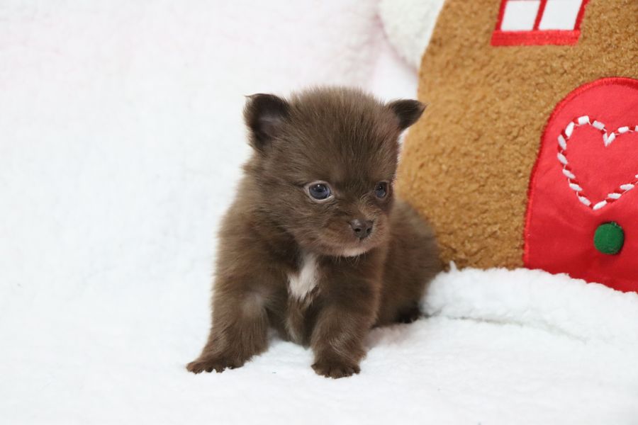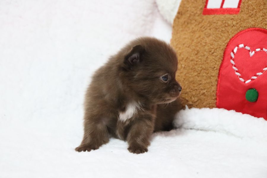 Disponible a la réservation , magnifique femelle pomchi chocolat et blanche née le 19/09/2025 .