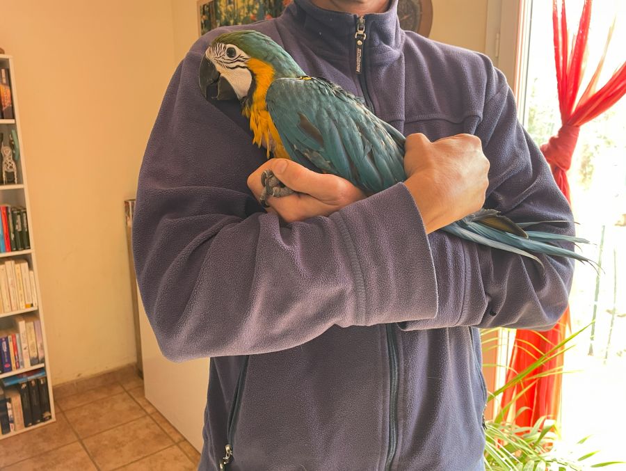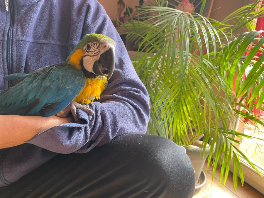 Bébé ara bleu et jaune femelle de 4,5 mois élevé main. Elle est gentille, très bien socialisée car elle vit au sein de la famille. Elle est bagué et sera cédé avec tous ses papiers.