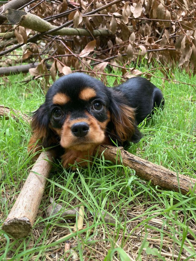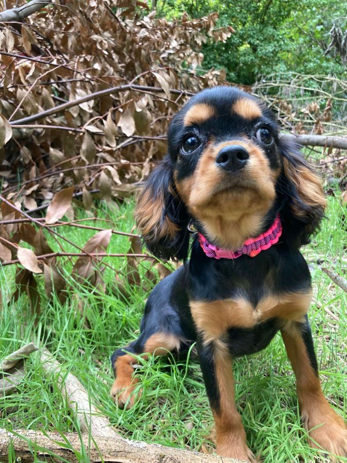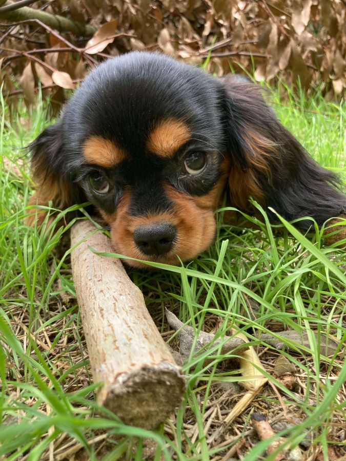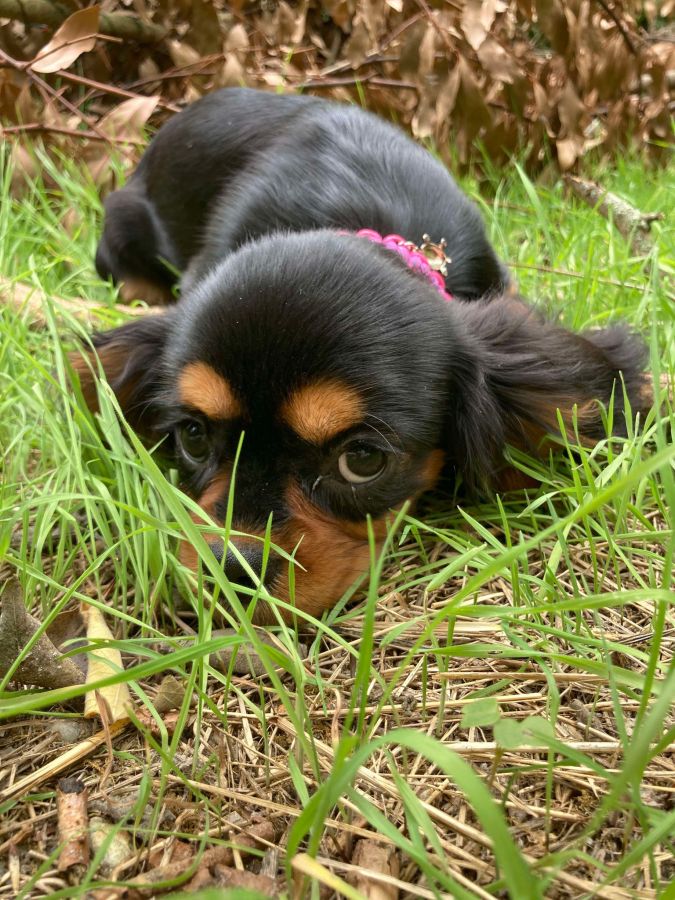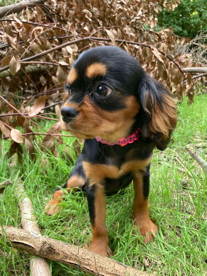 Augustine est une adorable petite femelle cavalier king charles noir et feu née le 22 avril 2025