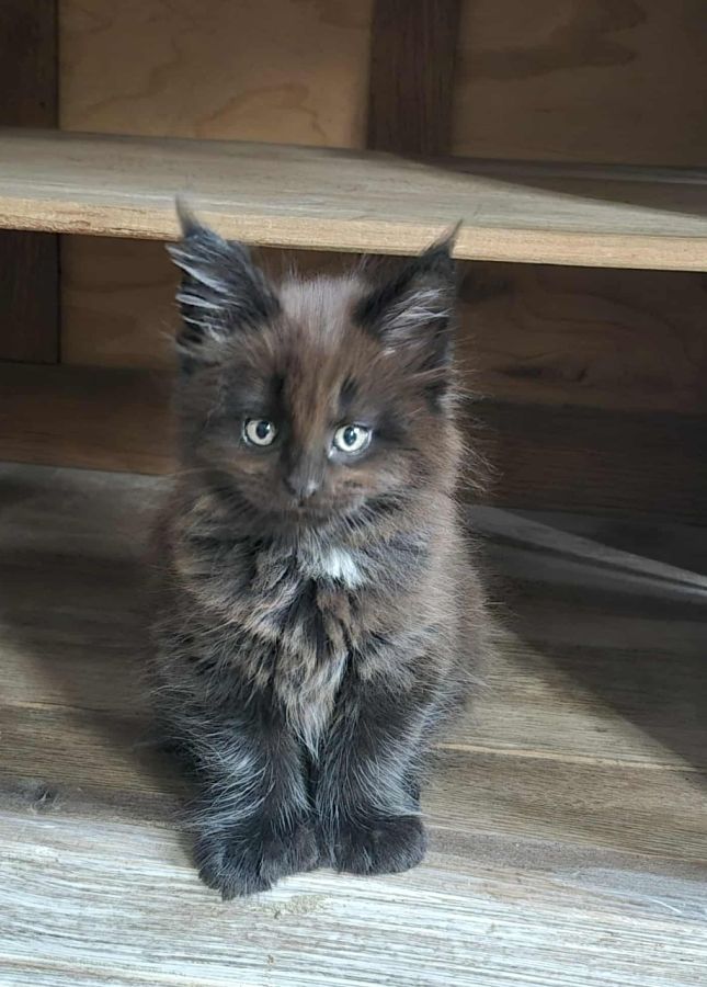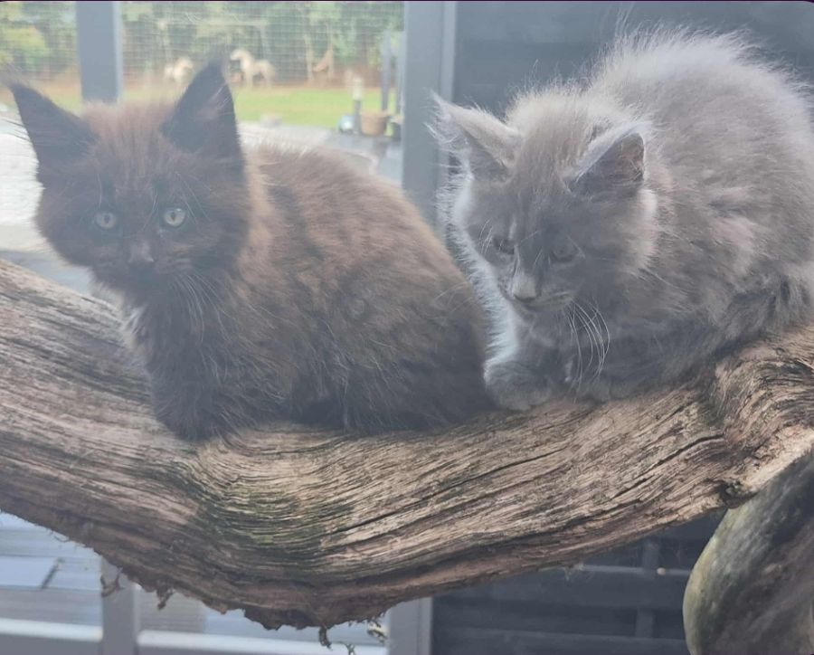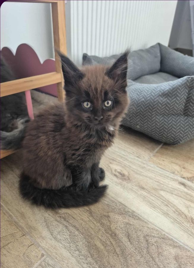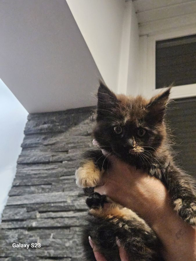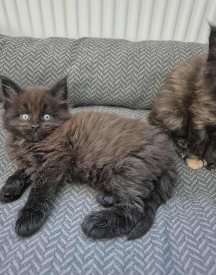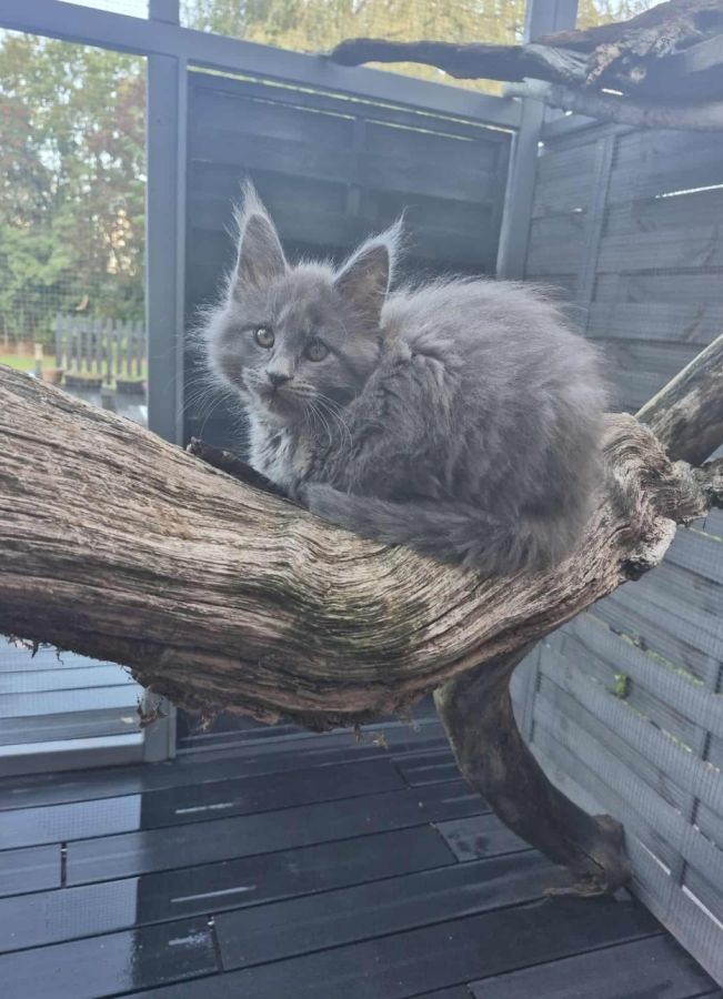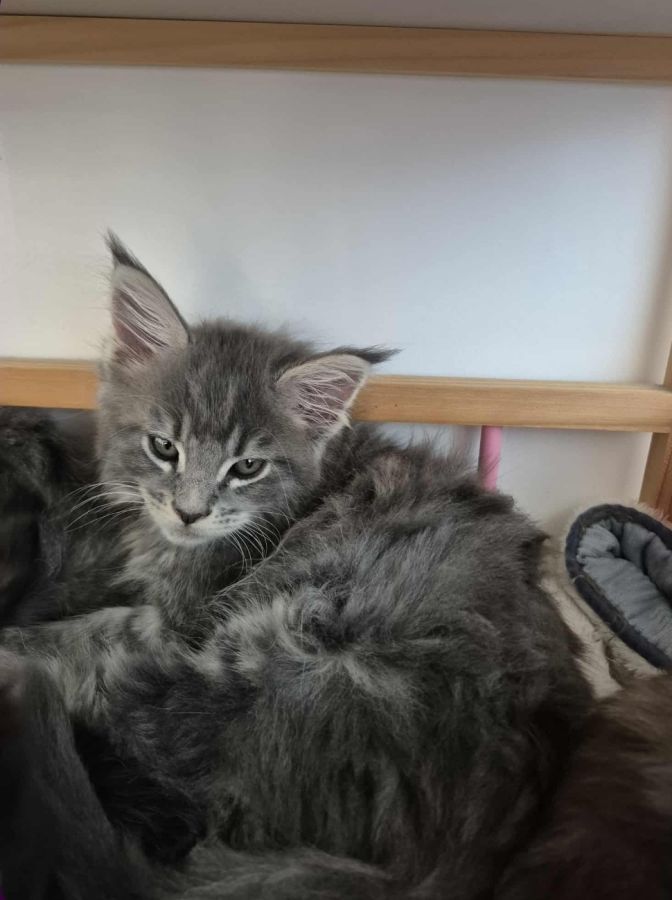 Sur une portée de 4 chatons Maine Coon très proches de l'homme. Véritables boîtes à ronrons et câlins. Nos petits chatons sont prêts à rejoindre leur famille de cœur, ils ont trois mois. Couleurs : silver, tortie, black smoke, red. N'hésitez pas à venir les rencontrer ! Plus de renseignements par message.