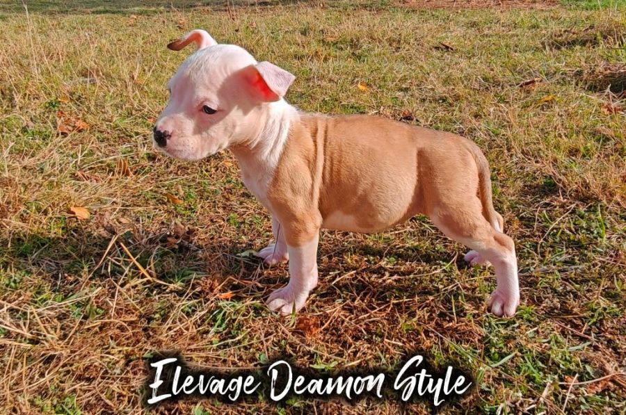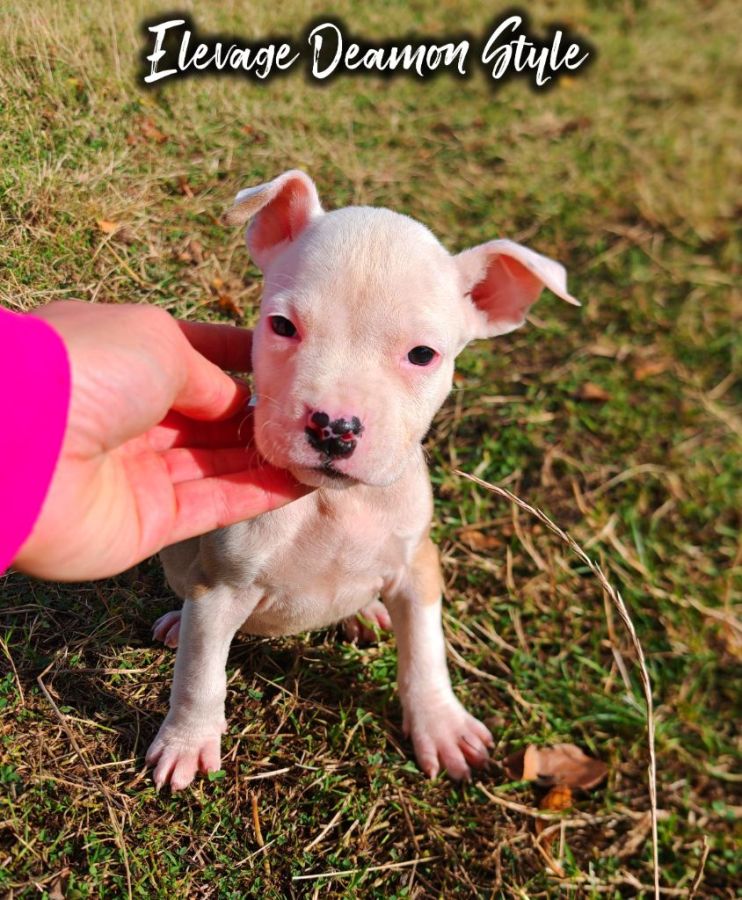Sur une portée de 9 bébés American Staff LOF il nous reste la jolie Azha'lya, disponible de suite âgée de tout juste 2 mois.