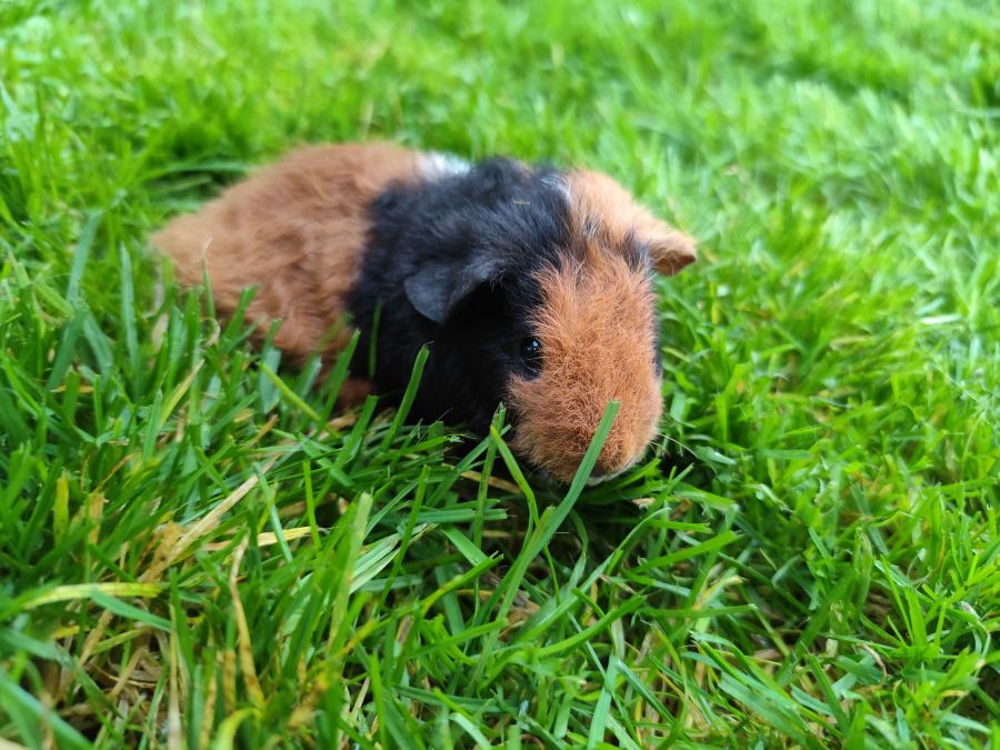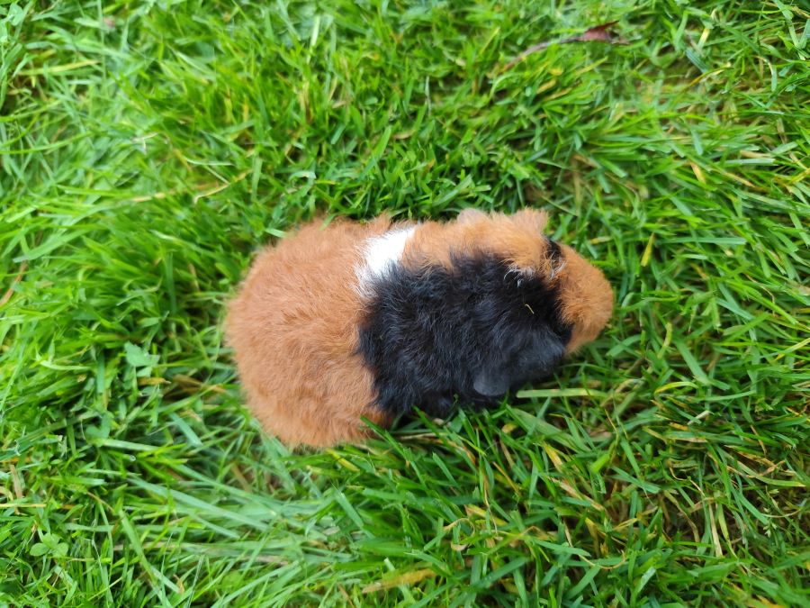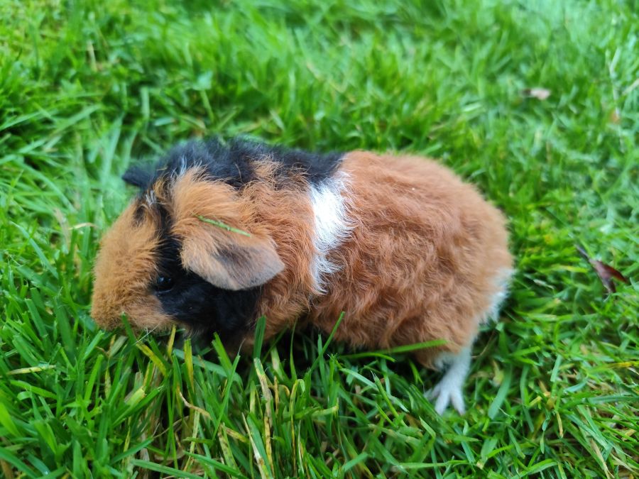 Bébé cochon d'Inde femelle tricolore, poils frisés, noir blanche et rousse. Elle est née le 23 septembre 2025, elle est donc disponible immédiatement à l'adoption.