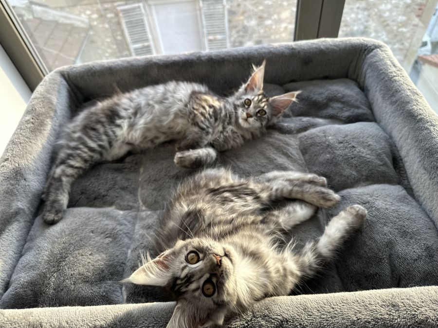 Bonjour , Je vous présente aiko et aruka : Maines coon née le 30 juin 2025 prêt à l’adoption une fois le certificat d’engagement des 7 jours signé (loi 2021) Il y a un mâle black Silver mackerel tabby caractère plutôt calme adore les câlins et une femelle black Silver blotched tabby seule petite fille de la portée de 6 chatons. Ils sont pucés , inscrit au loof , vaccinée Le mâle est à 1200€ et la femelle 1300€ N’hésitez pas à me contacté pour les rencontrés et plus de renseignements ✨