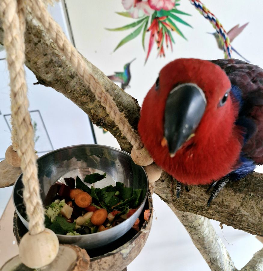Jeune femelle éclectus née en 2024. Elevée à la main puis placée en grande volière extérieure. Elle vient très b...
