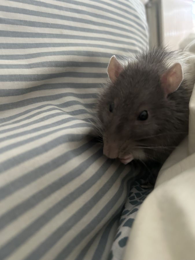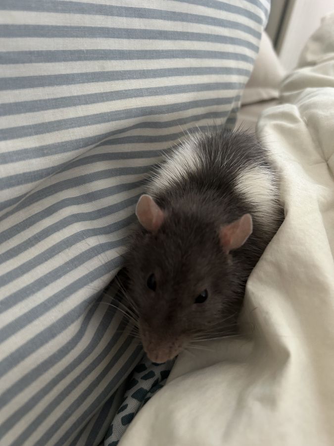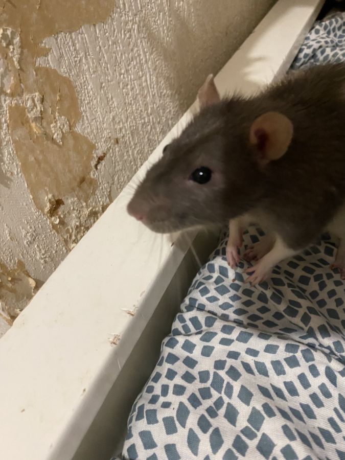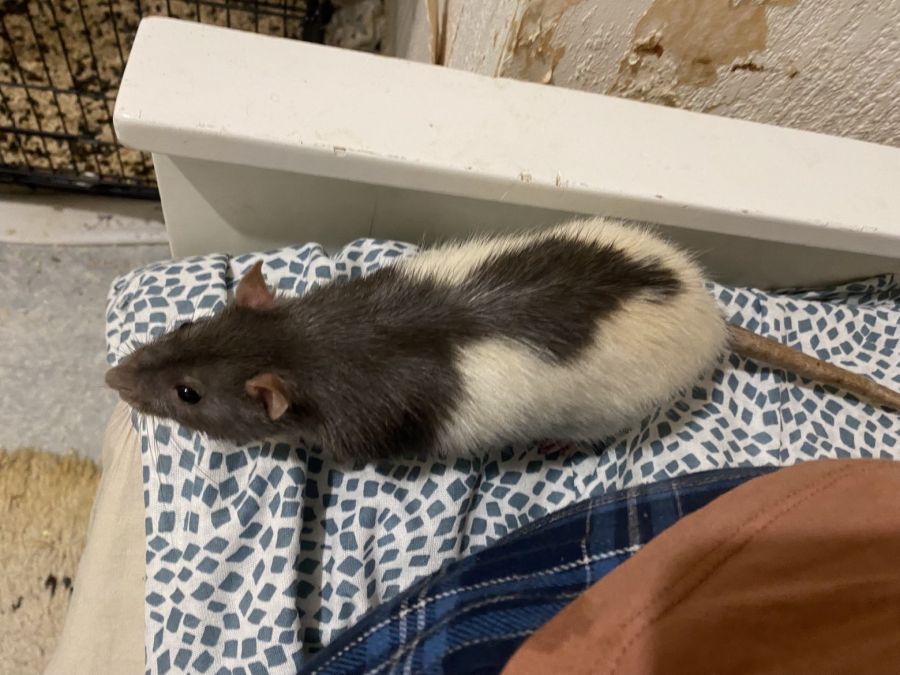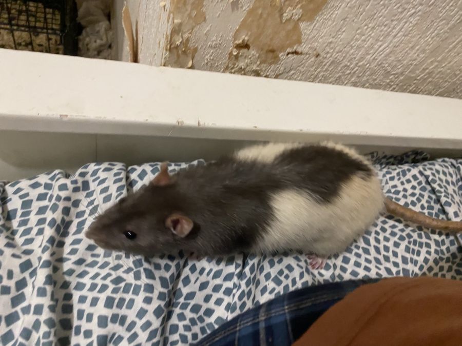 notre rats a 1ans et demi environ il est blanc et gris et pour plus d’information contacter nous en priver.