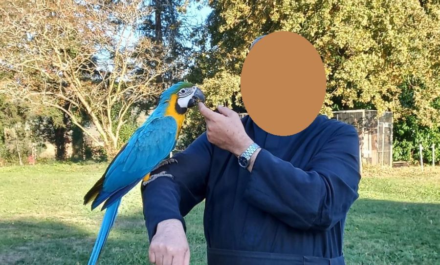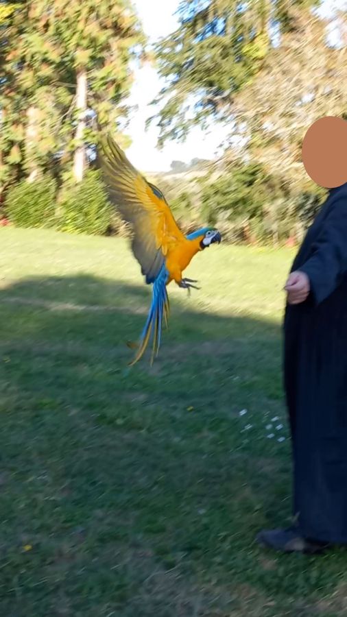 Cède jeune mâle ararauna de 2025, sexé ADN, parfaitement apprivoisé.