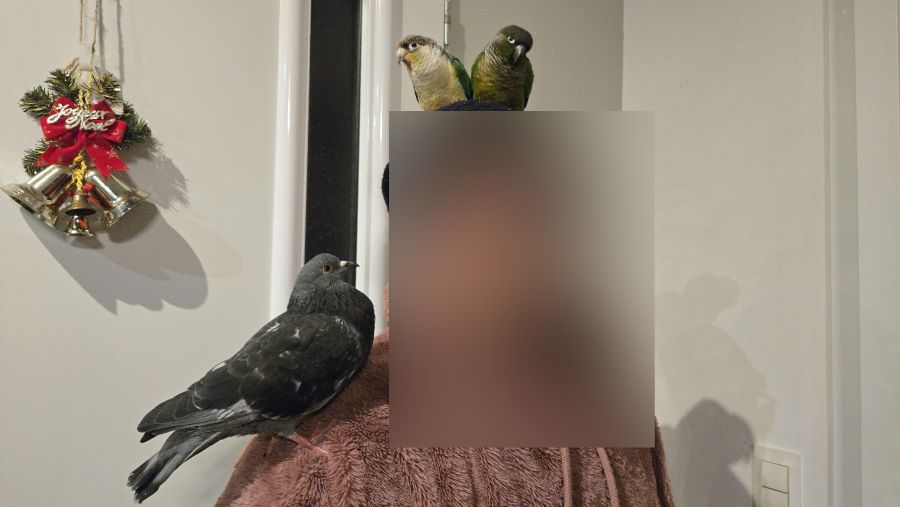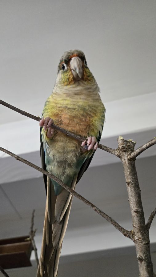Conure femelle de 1an et demi , EAM , en liberté à la maison et dans le jardin ( exterieur ouvert ) .