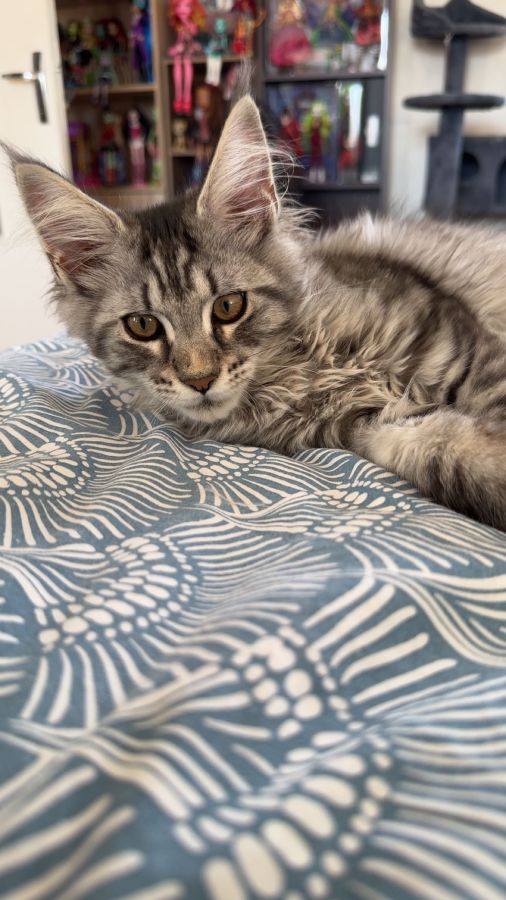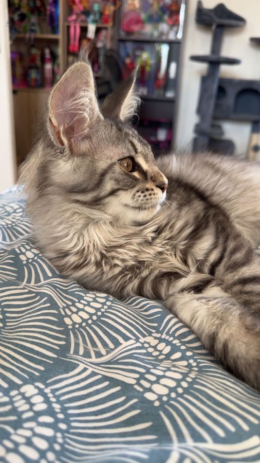 aiko mâle maine loof coon black Silver mackerel tabby née le 30 juin 2025 disponible dès à présent une fois le certificat d’engagement signé et les 7 jours de délai passé ( loi 2021). C’est un mâle très calme et qui adore faire des ronrons il est pucé , vacciné , vermifugé . Pour plus d’information n’hésitez pas à me contacté