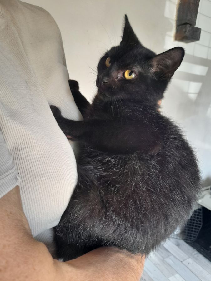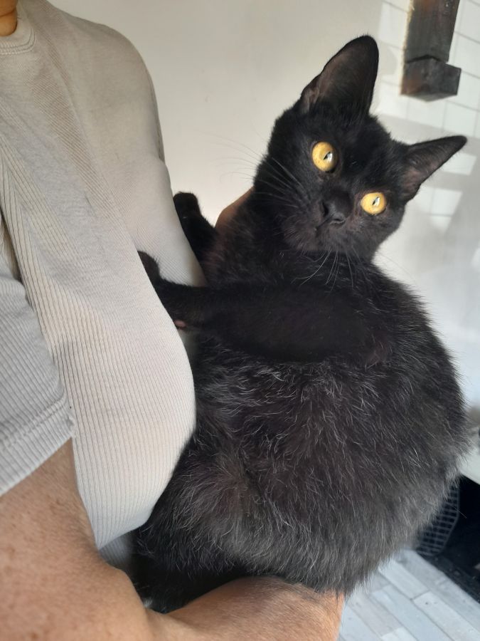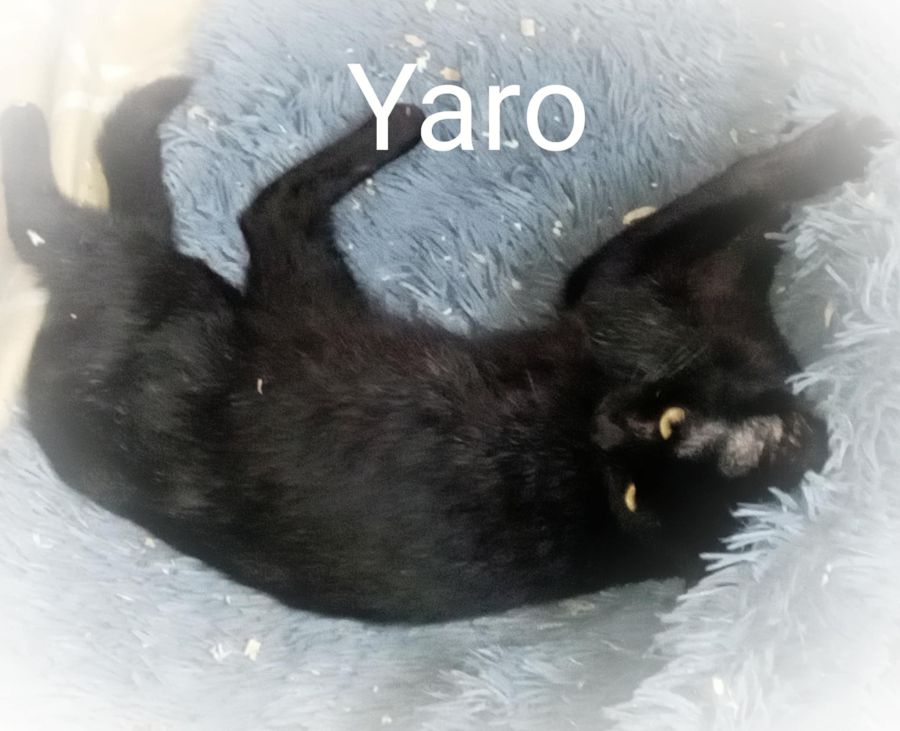 YARO Mâle européen poils court couleur noir et quelques poils marron à travers , âge 4 ans estimé je dirait 2 ans c'est un petit chat court sur pattes , c'est une chat adulte qui à été sauver de la rue sur la Réunion ,il adore les caresses mais n'aime pas trop être pris dans les bras longtemps, aime les enfants , propre ,sociable avec congénères chats ,chiens sur présentation