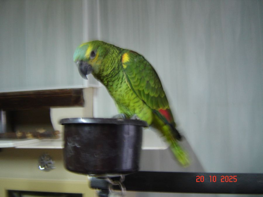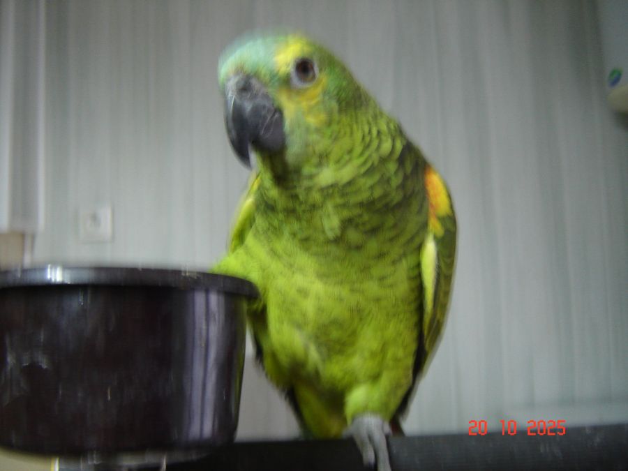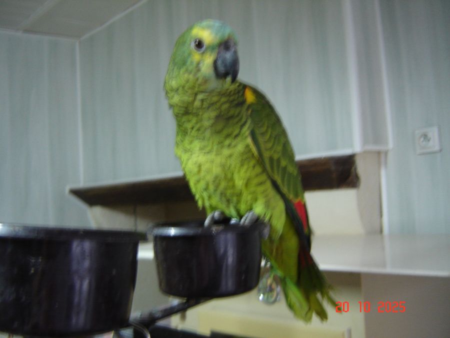 Jeune amazone a front bleu élevé a la main de 4 mois