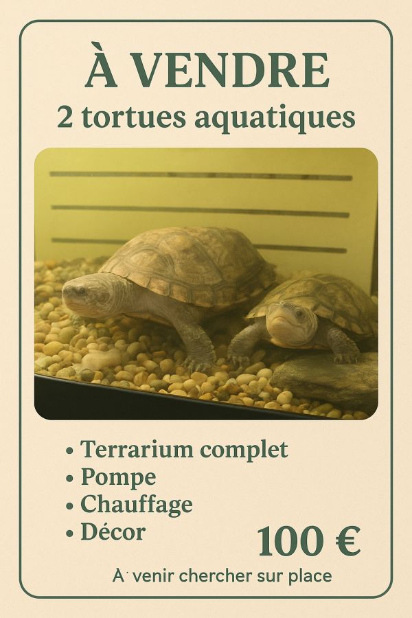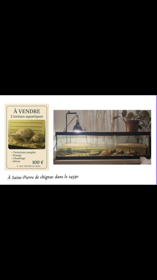 Bonjour suite à mon déménagement dans un appartement plus petit je ne peux pas garder mon terrarium 120 cm de long avec dedans deux tortues aquatiques je suis donc dans l'obligation de m'en séparer pour manque de place et surtout manque de temps car je travaille plus de 12 heures par jour et je n'ai donc malheureusement pas trop de temps à leur consacrer