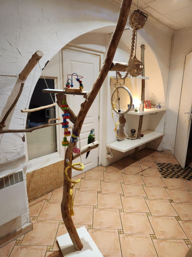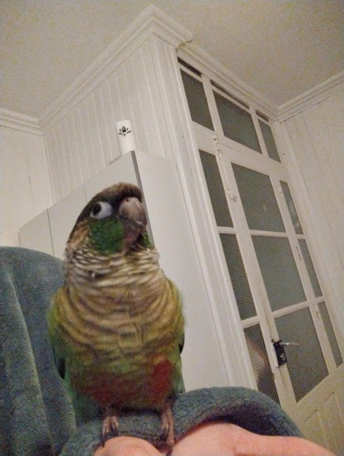 Conure femelle de 1an et demi , EAM , en liberté à la maison et dans le jardin ( exterieur ouvert ) . Apprivoisé.
