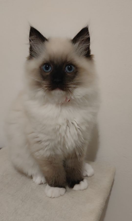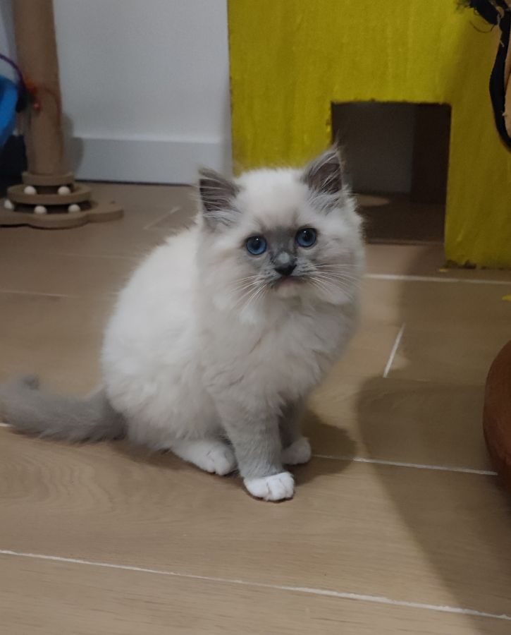 Nos magnifiques petits choux sont issus de l’union de notre chatte Saphir (Sansa de Dom de Moussia, de son nom de naissance) une femelle Ragdoll seal point, et de Nirvana, mâle blue point et blanc d'une autre chatterie (Du Jardin de Dolly). Nirvana est champion international (IC), titre FIFe reconnu par le LOOF. Les parents sont visibles dans les photos.