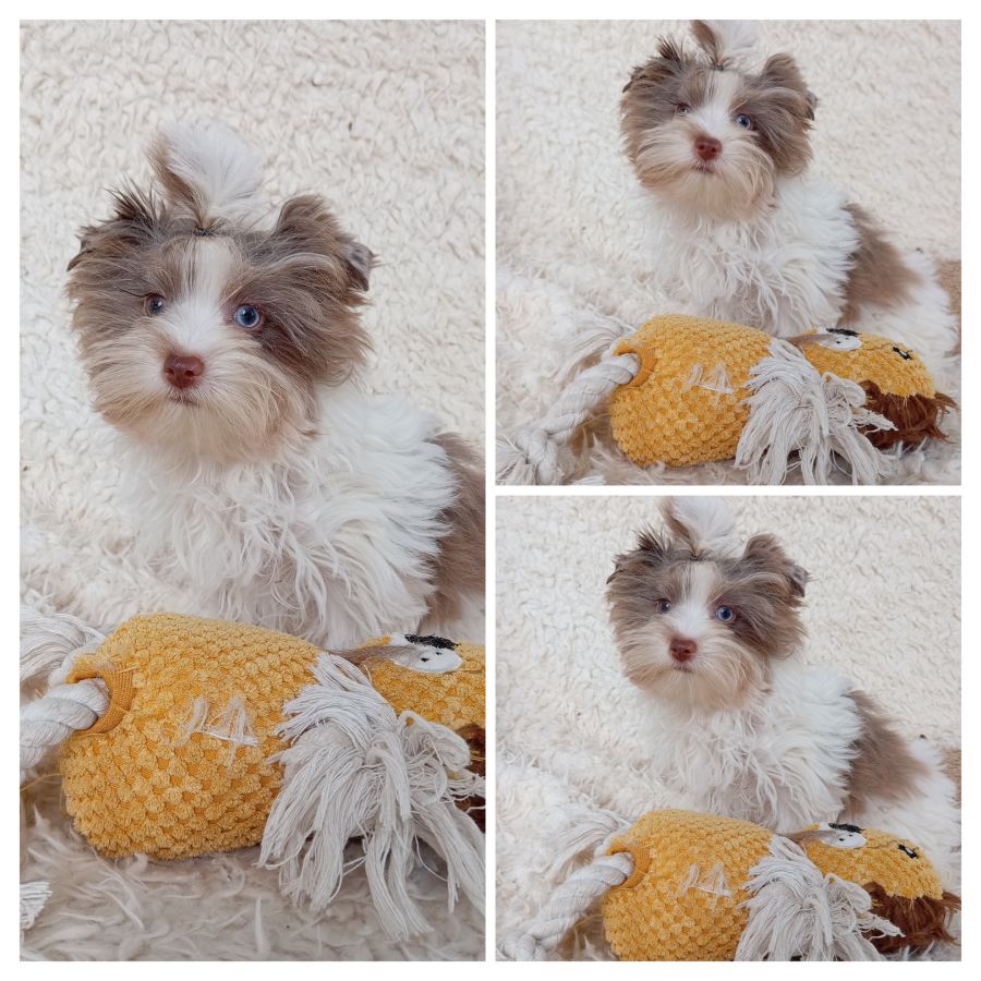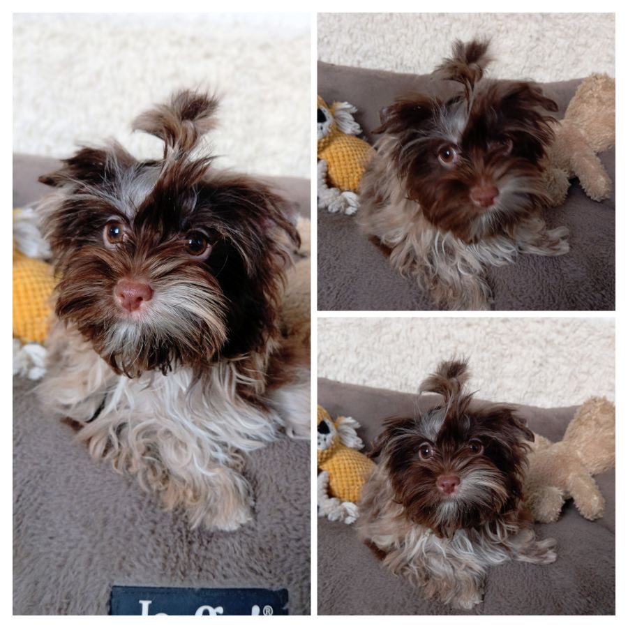 Le Fenil des canailles propose à l'adoption une petite portée de yorkshire de couleur exotique née le 19 juillet 2025(chocolat, choco berry et choco merle).