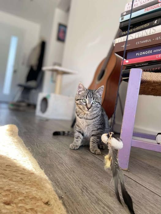 Cette minette a été recueillie errantes dernièrement. Elle a un magnifique pelage tigré et de grands yeux charmeurs.