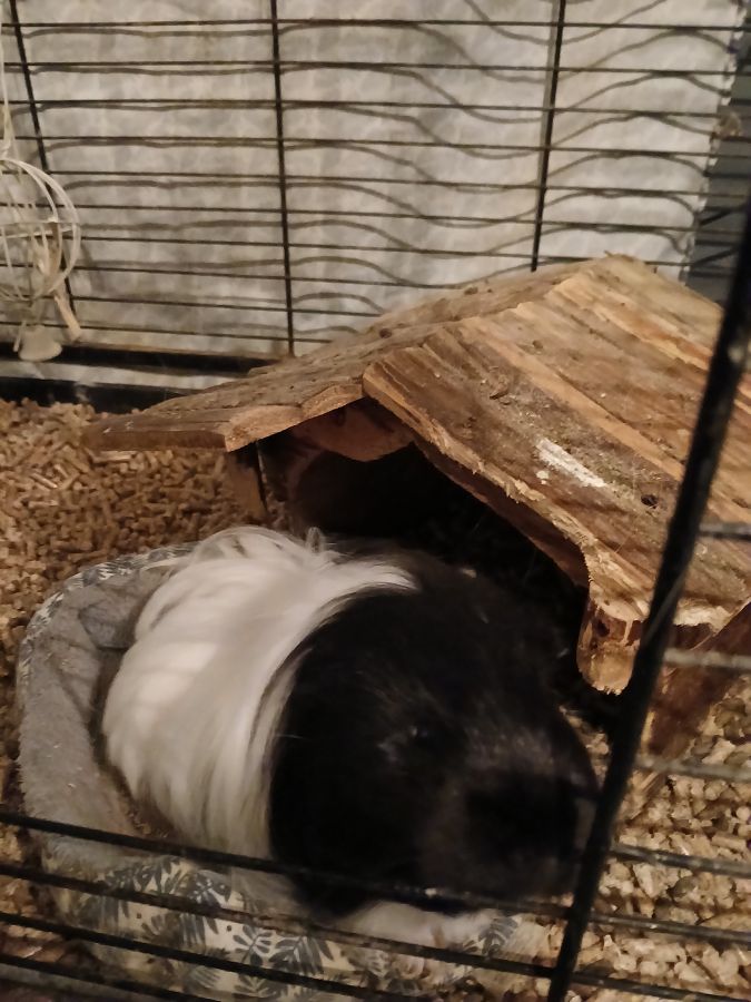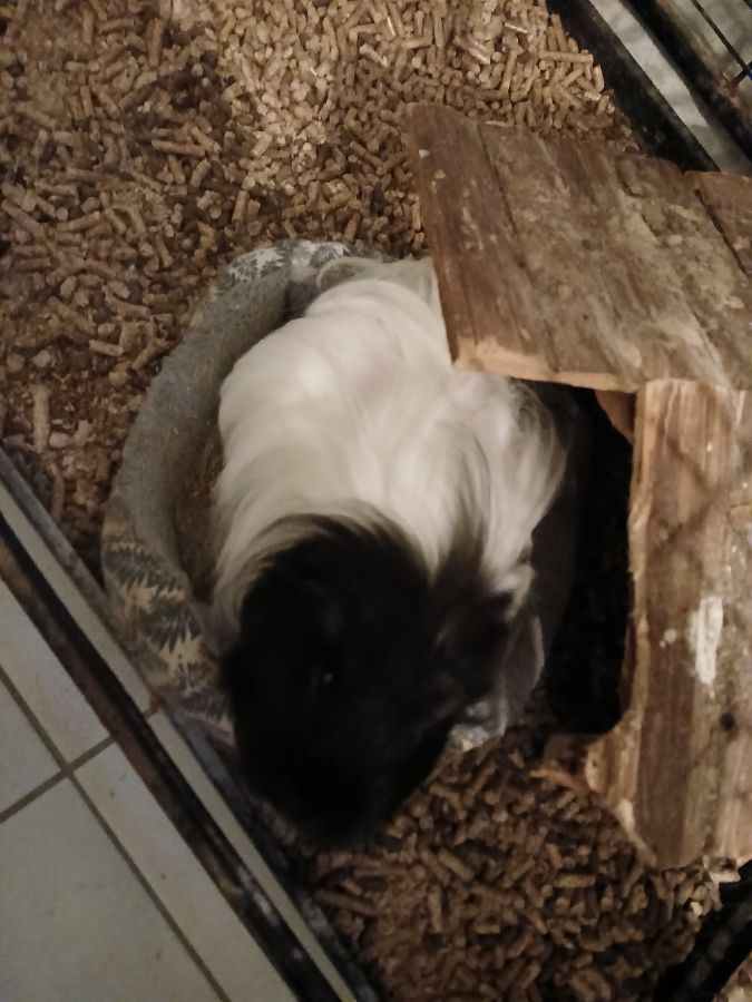 Donne cochon d'inde femelle d'environ 1 an 1/2 poils longs noire et blanche.