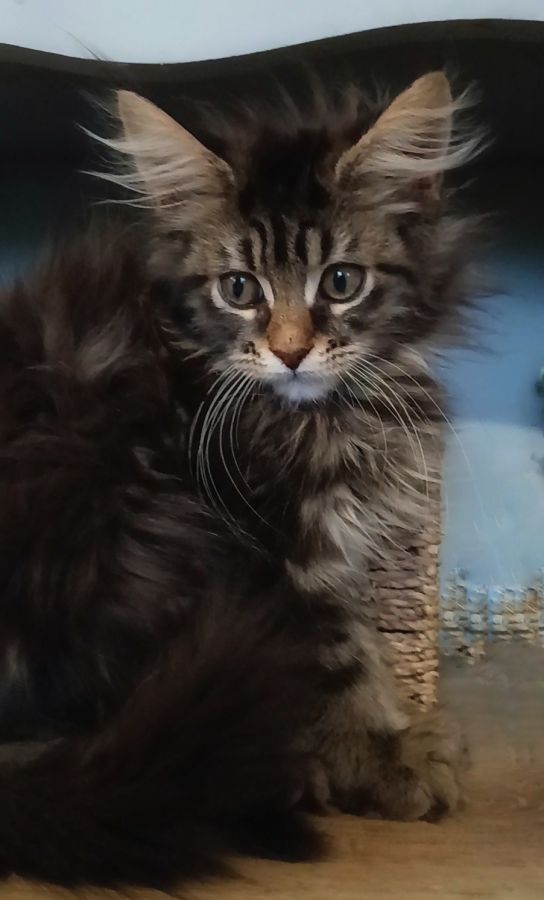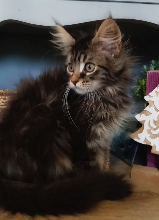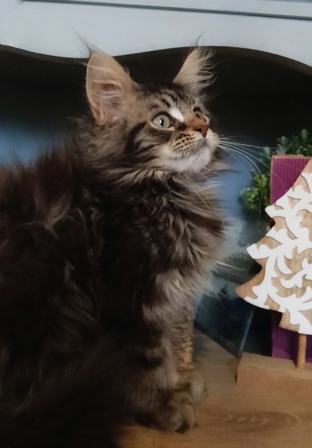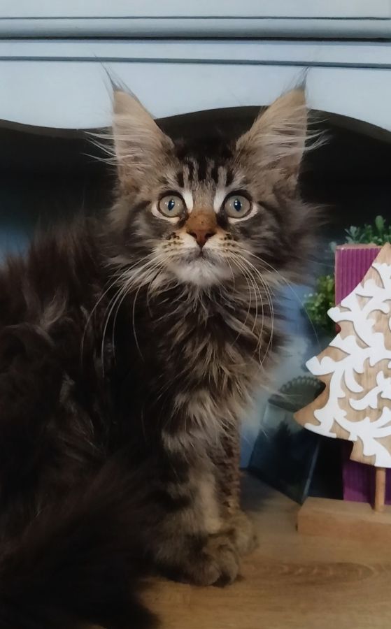Nous vous proposons Albus, magnifique chaton Maine Coon brown blotched tabby, tout juste 3 mois, parfaitement habitué à la vie de famille.
