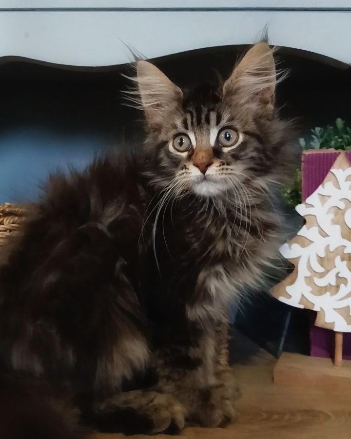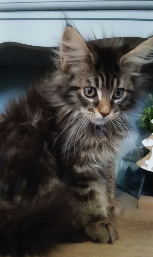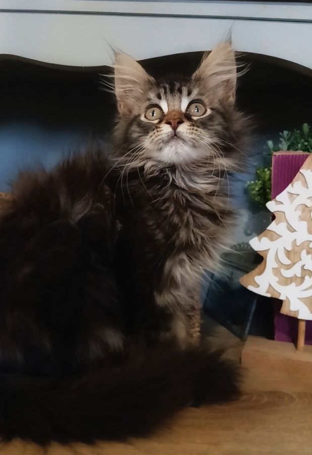 Nous vous proposons Albus, magnifique chaton Maine Coon brown blotched tabby, tout juste 3 mois, parfaitement habitué à la vie de famille.