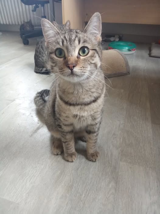 Laya est une magnifique minette au pelage tigré gris qui vire au roux au soleil,et aux jolis yeux verts maquillés d'un trait d'eye-liner.