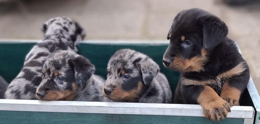 Arlequin et Noir et feu de VASCO argenté de la Pierre d’Allat et de ULMA de Boichaille. Les parents travaillent au quotidien sur troupeau ovin et bovin. Chiens équilibrés qui trouveront leur place au milieu de la famille, pour la garde, le sport canin ou chez des paysans pour le travail au troupeau.