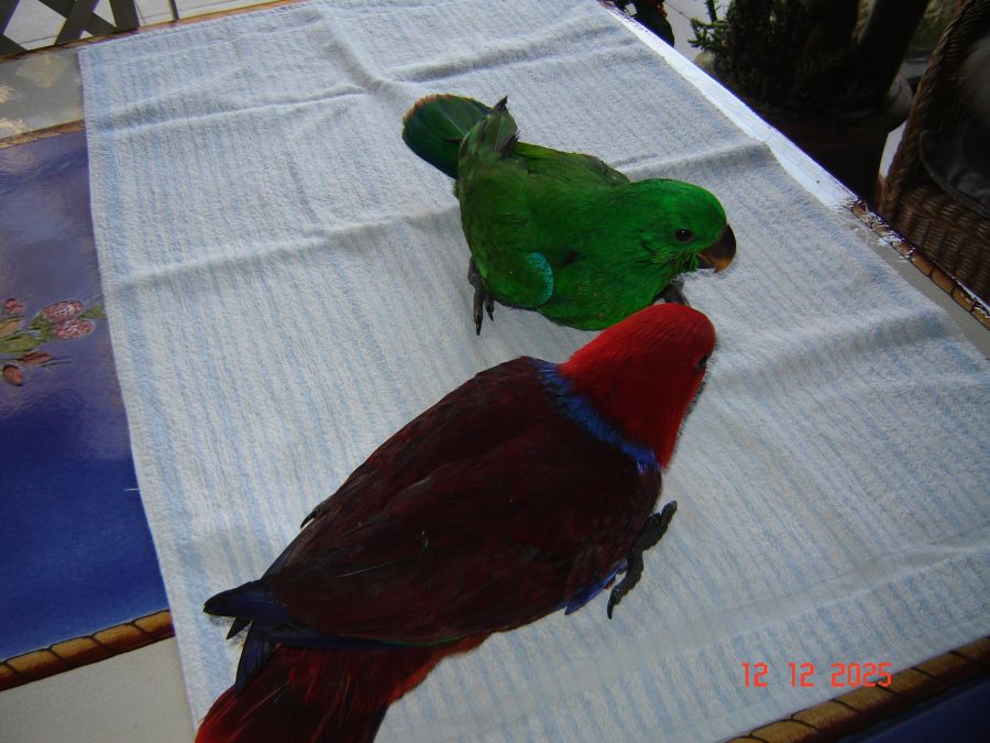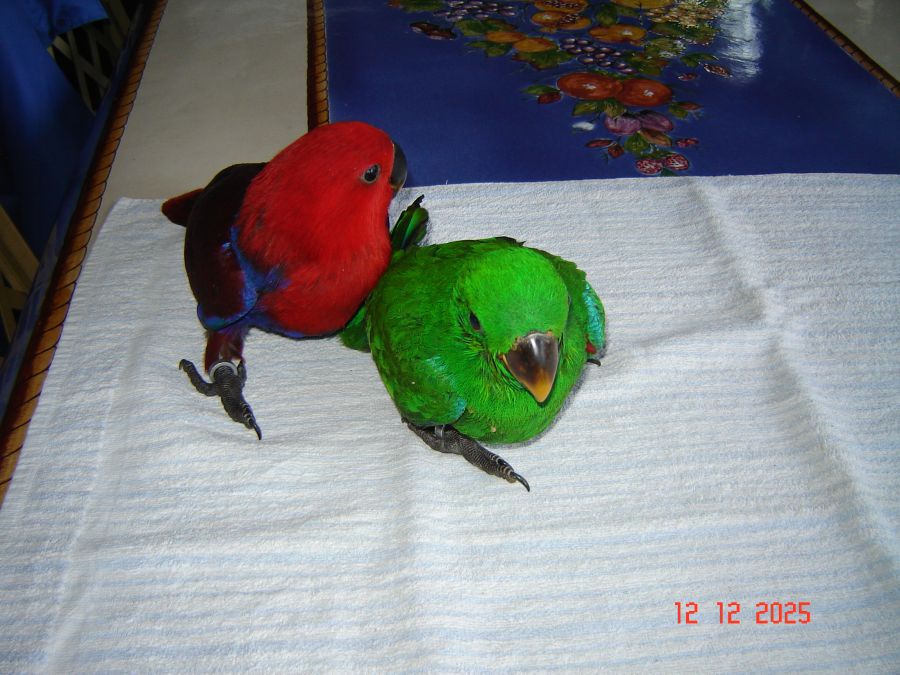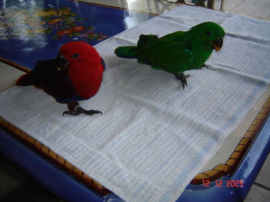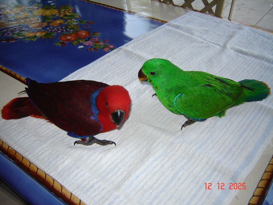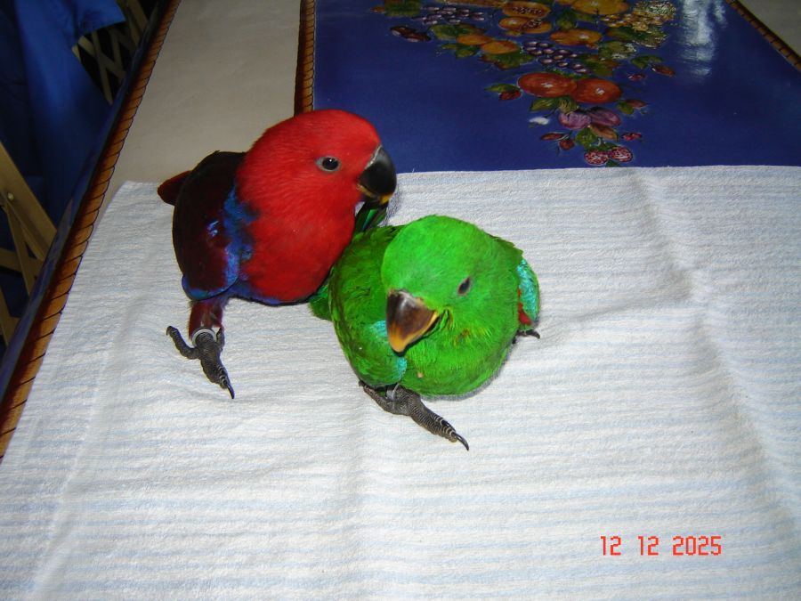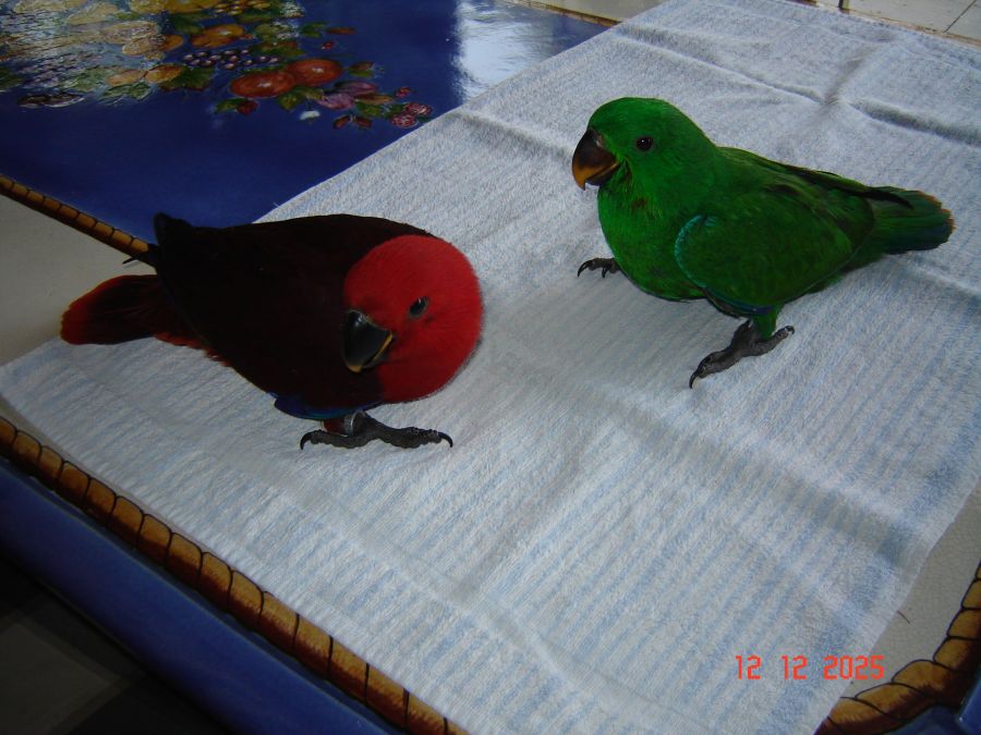 Jeune Mâle Ecletus, complètement Elever a la Main, commence déjà a manger seul des fruits frais, apprécie encore...