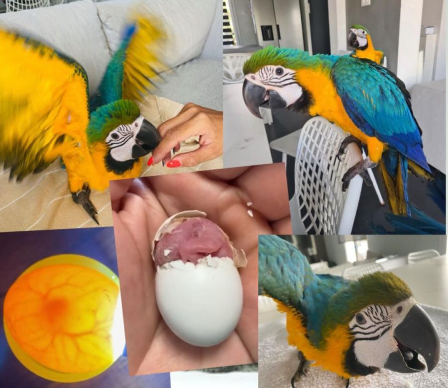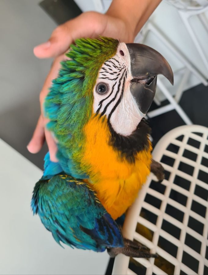 Bébé femelle Ara Ararauna très caline, élevée à la main depuis son éclosion.