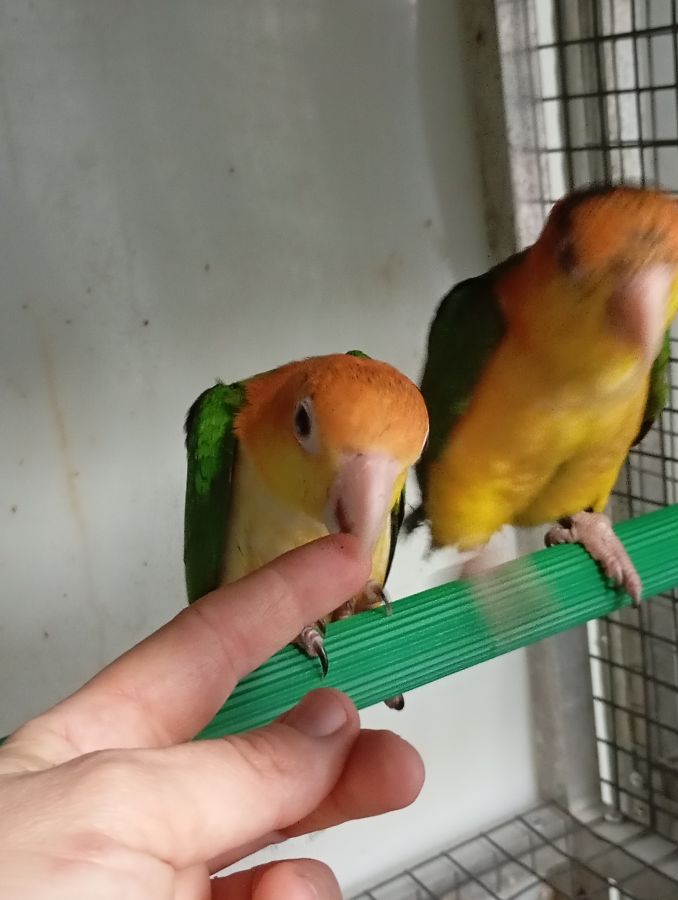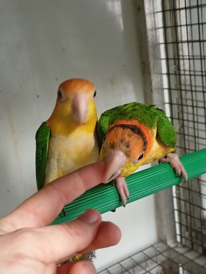 Ils ont été élevé à la main, les jardines sont très câlins, les caïques viennent toucher les doigts, mais ne se laissent pas manipuler. C'est possible de les apprivoiser avec plus ou moins de temps.