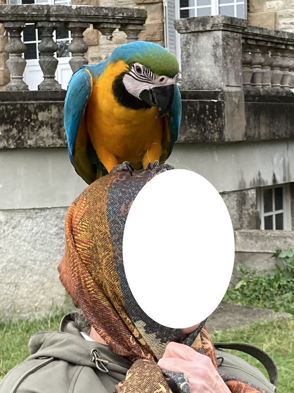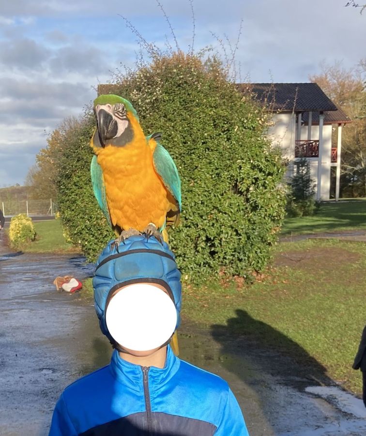 Jeune Ara Ararauna de 5 mois (éclos début juillet 2025), mâle sexé ADN, bague fermée CDE, parfaitement apprivoisé, très affectueux, habitué à rester en volière extérieure et en intérieure, habitué aux vols libres : revient quand on l'appelle, s'habitue très vite aux nouveaux venus.