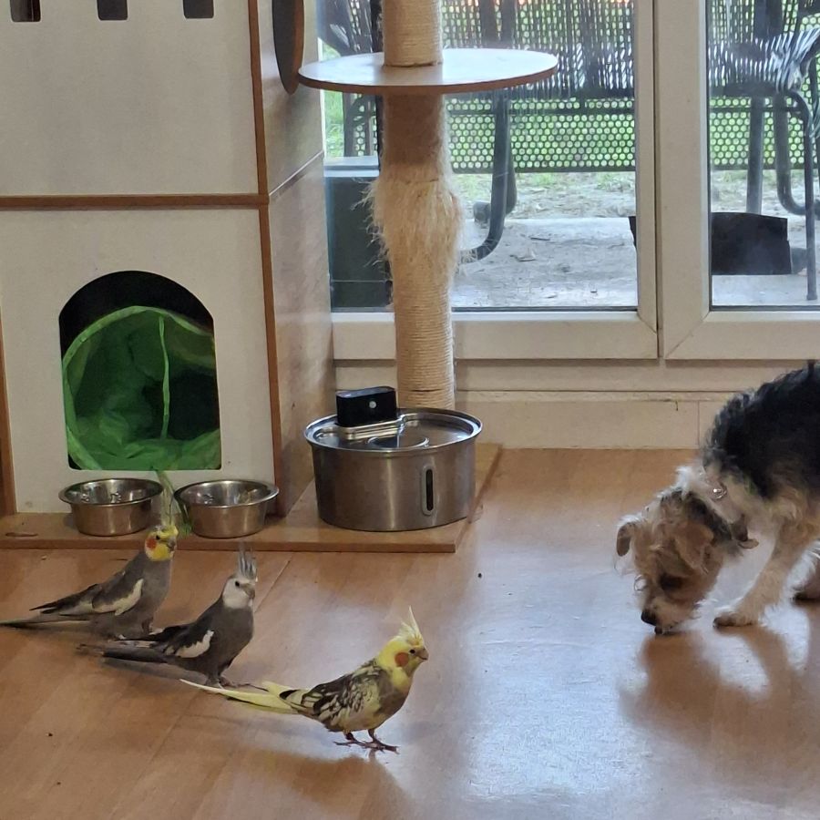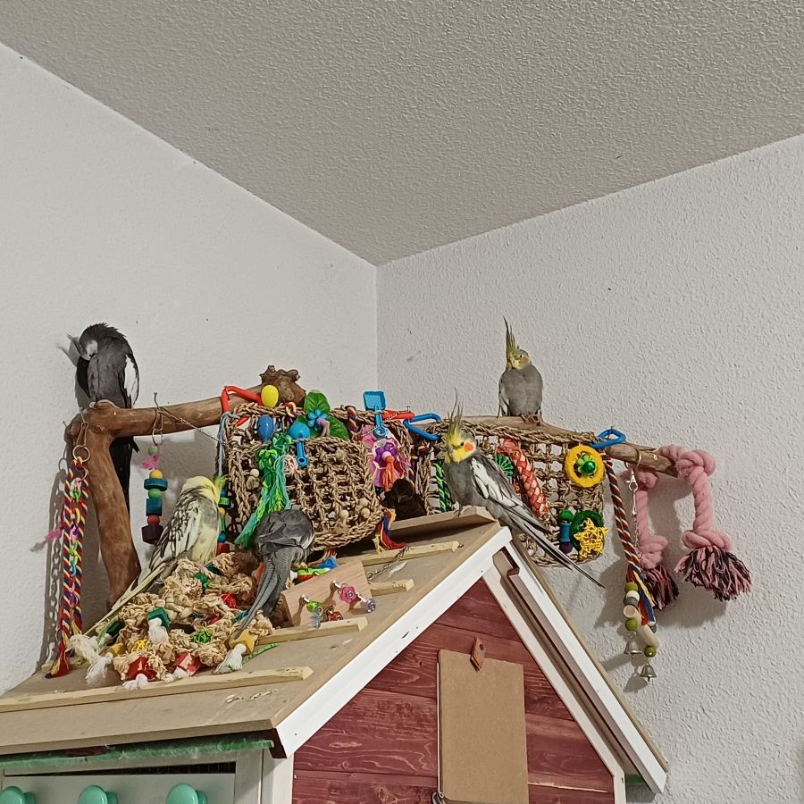 Nous devrons être assurés qu'il resterons toujours ensemble, qu'ils sortiront de la volière le jour et rentrerons la nuit rassurés par un voilage. Vie à l'intérieur de la maison. Interactions avec leur humain.