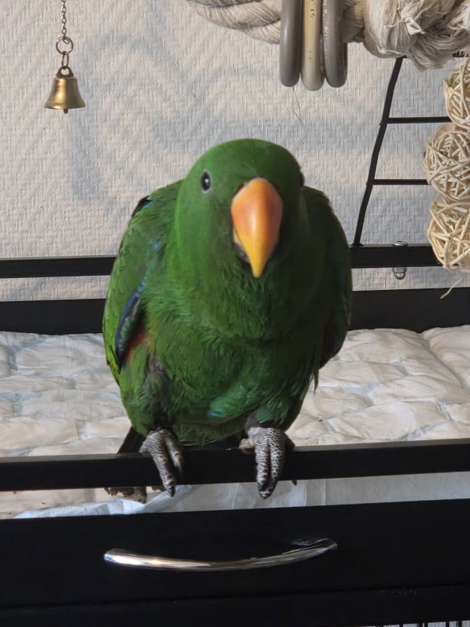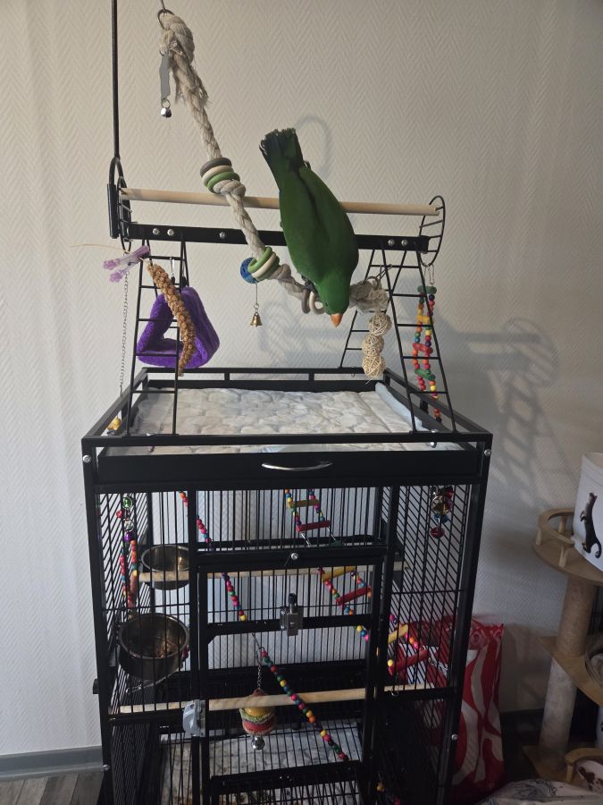 Jeune perroquet éclectus de 6 mois avec sa cage