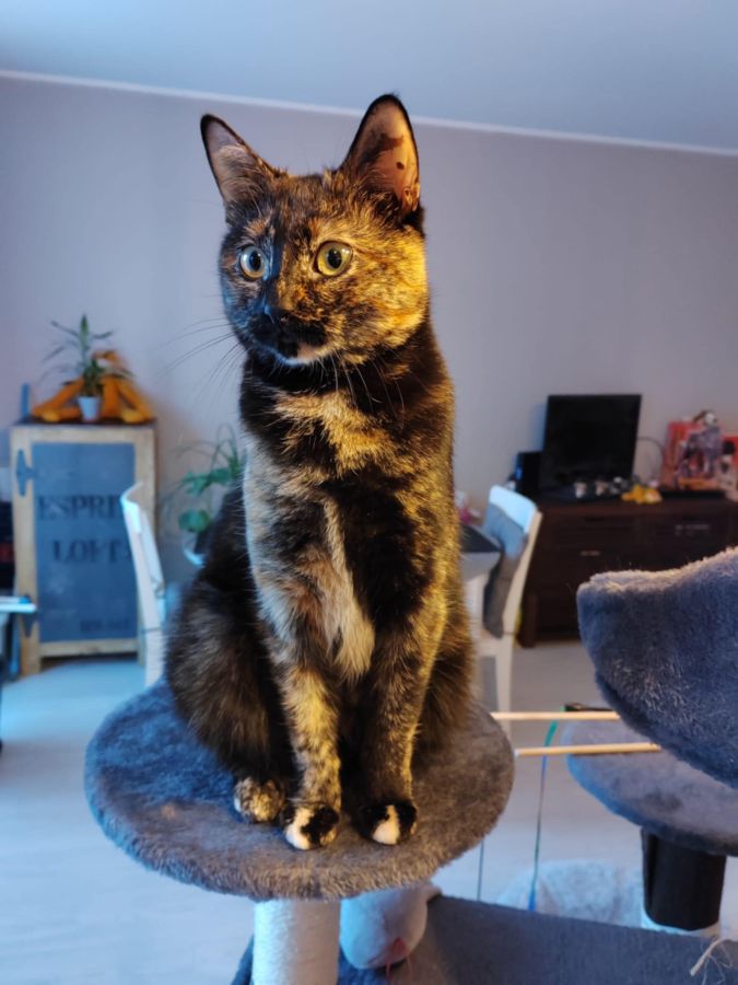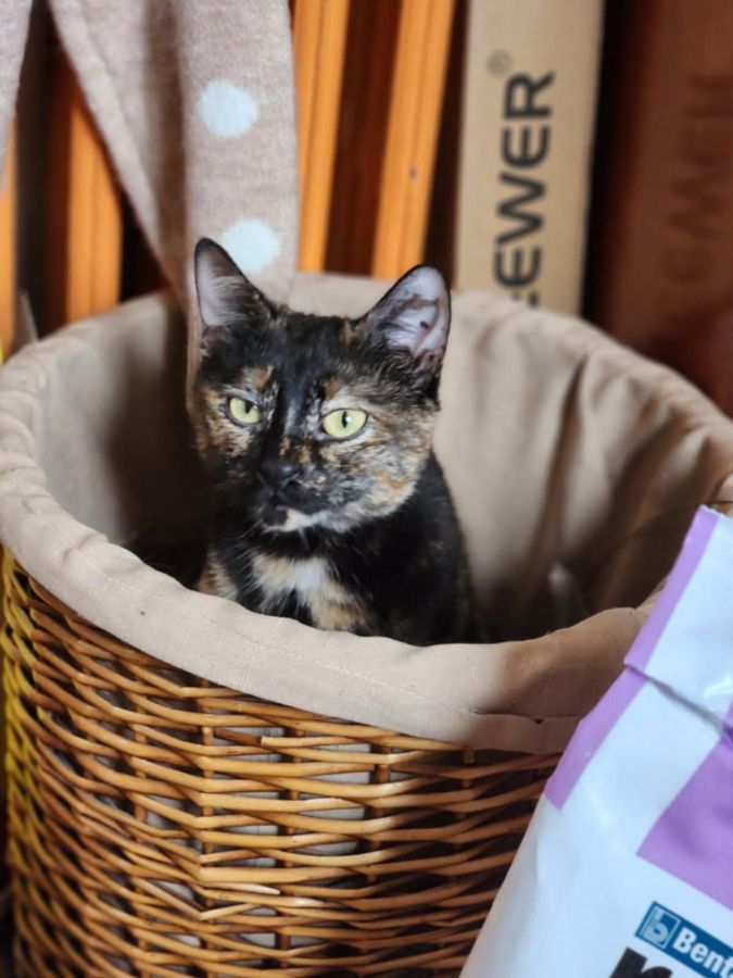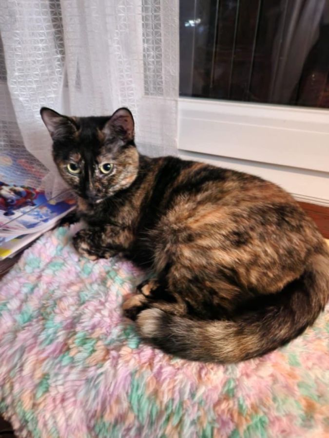 Danaé est née le 25 février 2024, c'est une belle écaille câline et très docile, toujours de bonne humeur. Danaé aime jouer et vous ramènera balle ou boules de papier pour vous inviter au jeu . Danaé passe beaucoup de temps à observer l'extérieur. Elle viendra vous faire des câlins à votre lever et dès que vous rentrerez du travail. Danaé sera le seul chat du foyer car elle a ses têtes félines et on évitera les tout jeunes enfants. Elle a besoin de calme, sa famille d'accueil dit d'elle qu'elle est une crème.