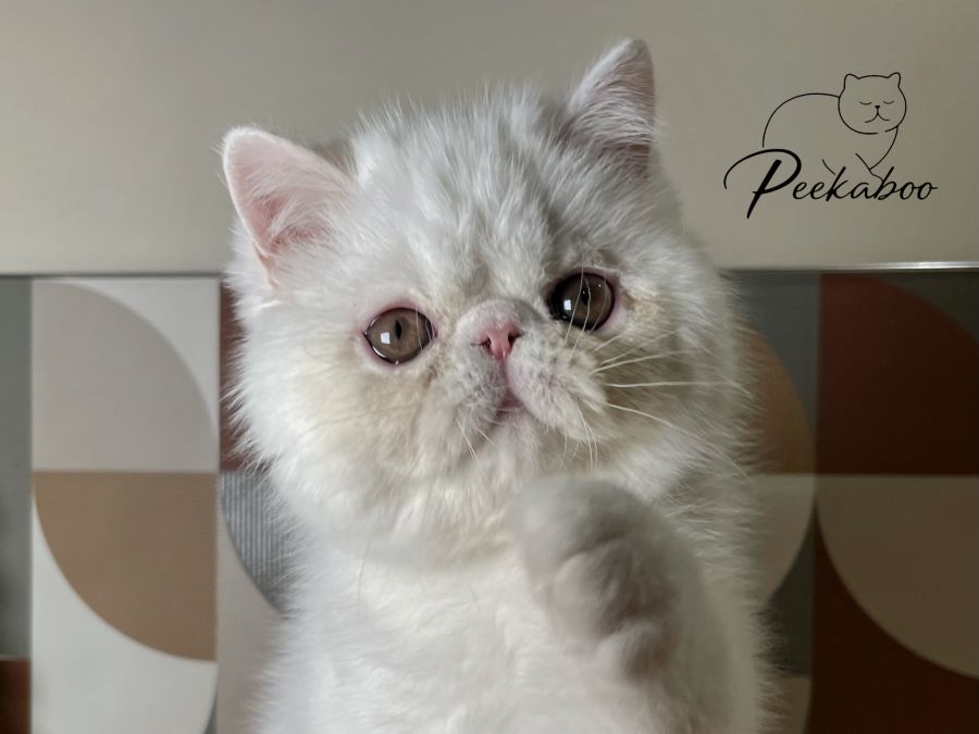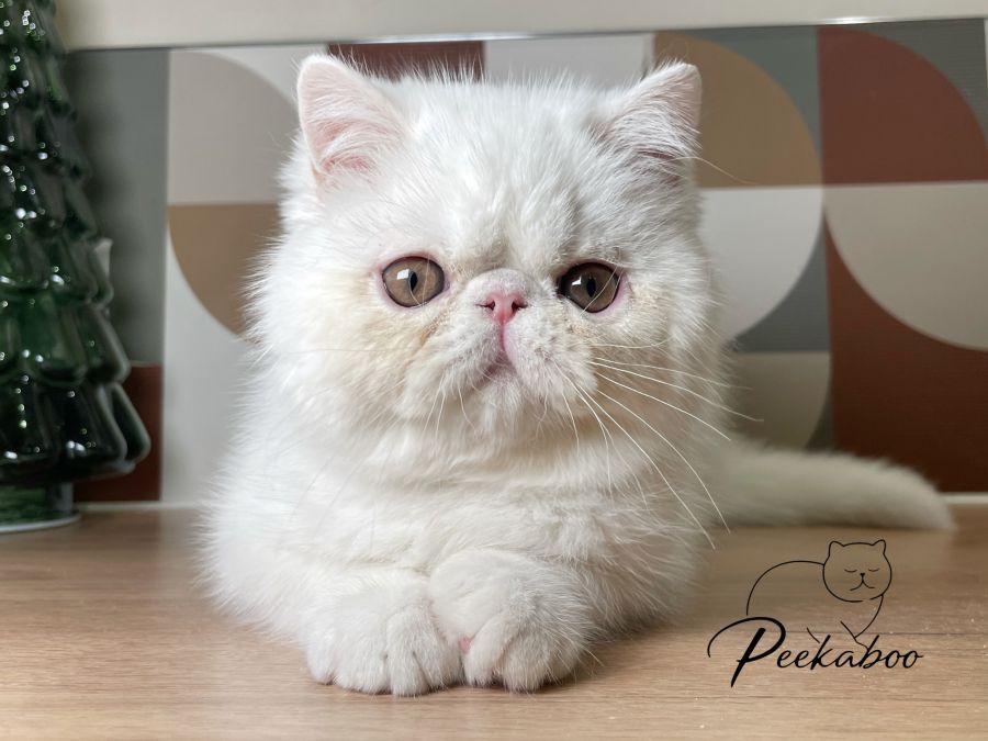 La chatterie Peekaboo a le plaisir de présenter deux mâles Exotic Shorthair blancs aux yeux or, nés le 1er octobre