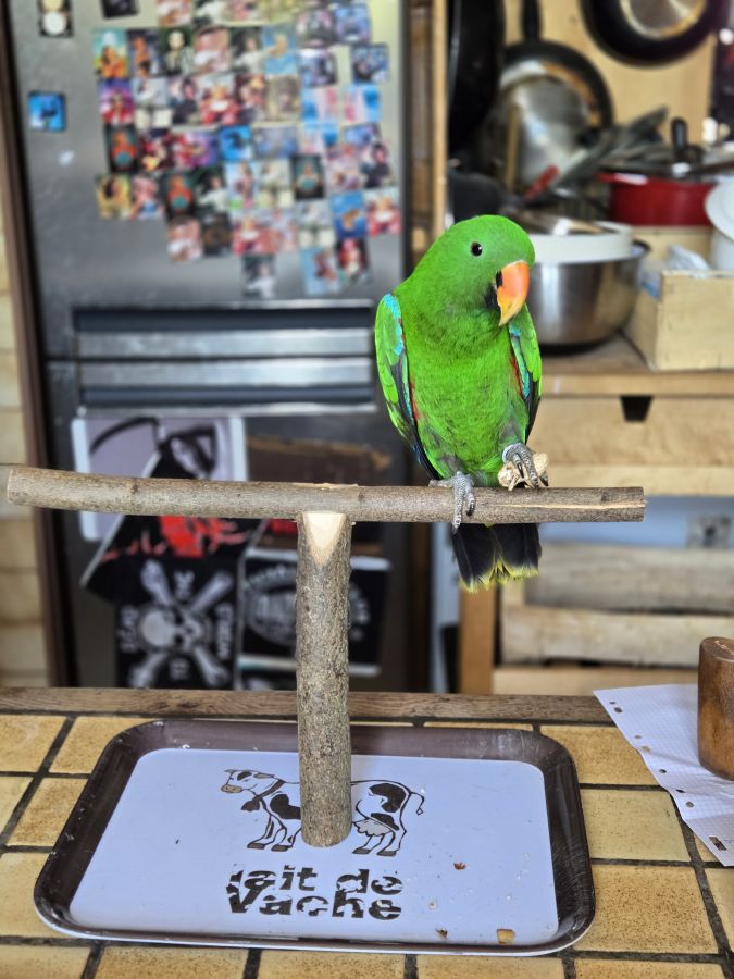 Il est habitué aux enfants (de tout âge) aux chats et aux autres oiseaux.