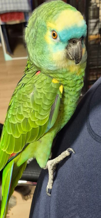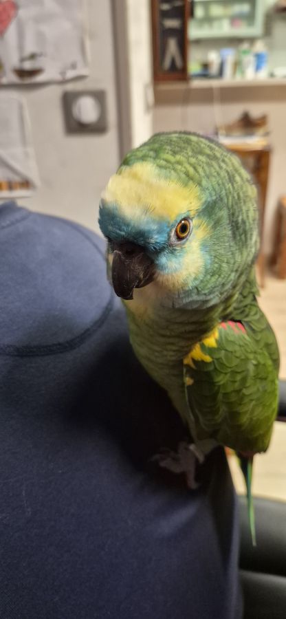 Magnifique Amazone à front bleu, né le 22 avril 2025. Élevé à la ma...