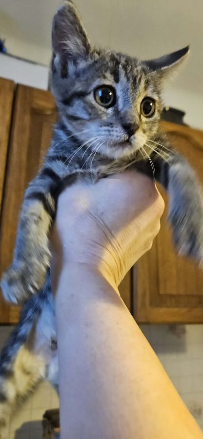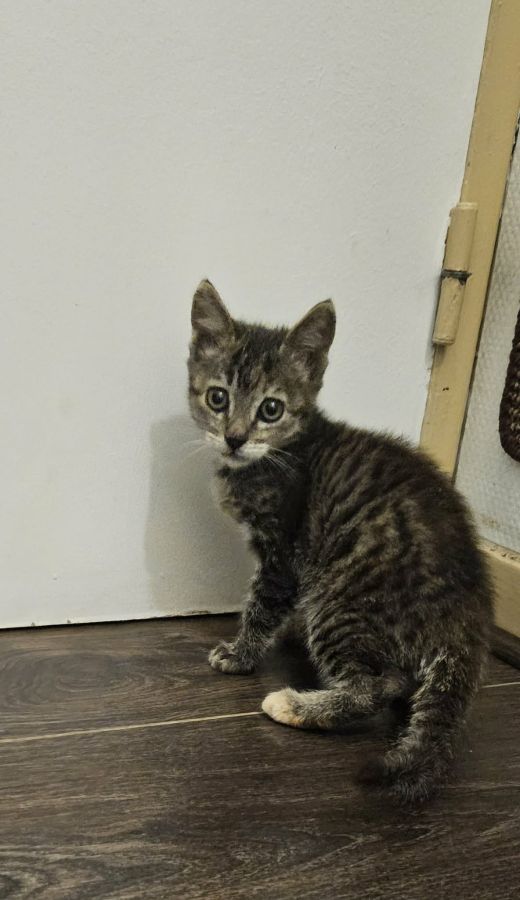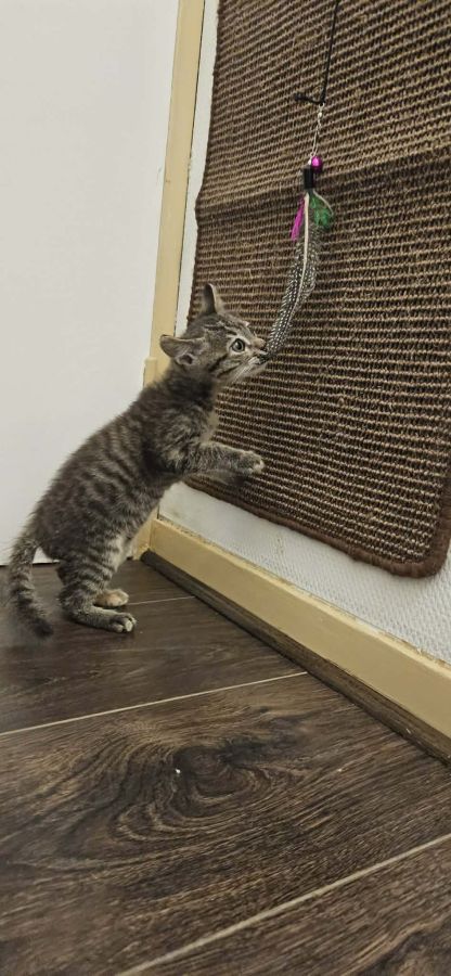 TIGRESSE CHATONNE FEMELLE européen poils court couleur gris noir européen , âge 2 mois estimé , c'est un chaton sauver de la rue sur la Réunion , propre , c'est un chaton