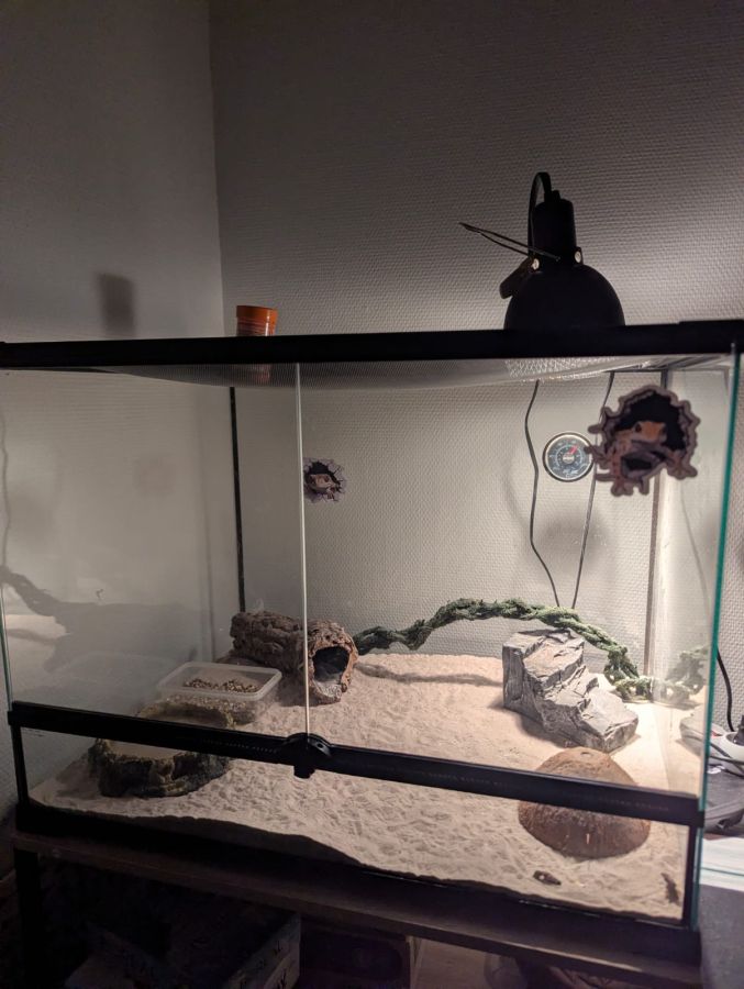 Aménagement : Substrat en sable, multiples cachettes et décors variés.
