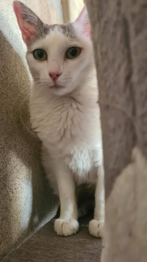 TESS est une très jolie minette blanche avec quelques tâches grises, de type européen non loof, né approximativement début avril 2022.