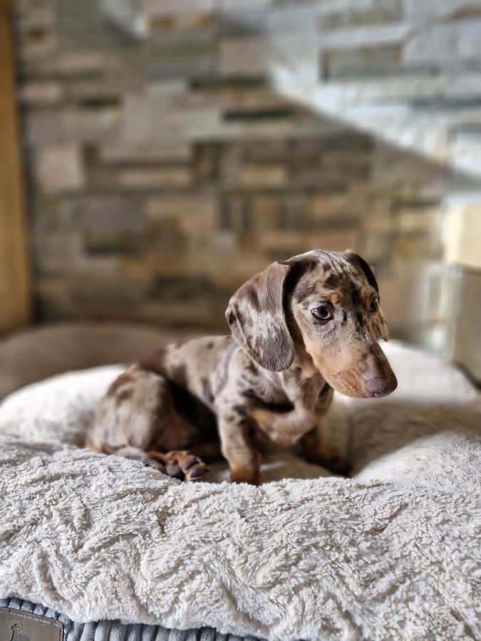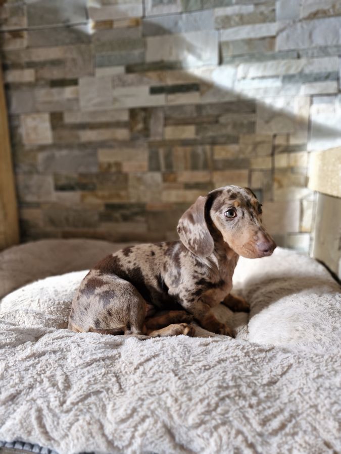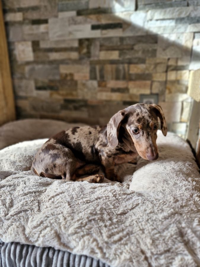 L'élevage familial "Un ami pour la vie " vous propose Nala femelle teckel arlequin chocolat poil ras non lof disponible des maintenant.