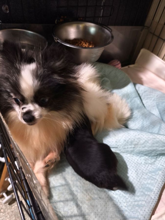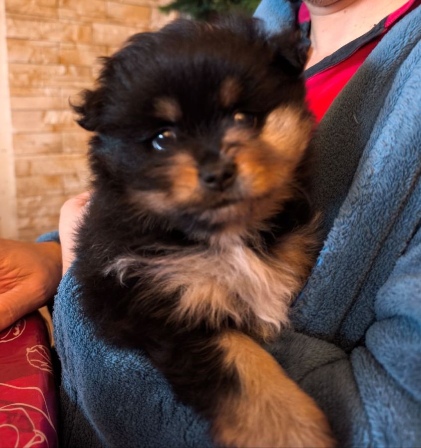 Chiot apparence SPITZ née le 14.11.25 femelle black and tan merle, issus de mère naine merle blanche et grise et de père petit black and tan.