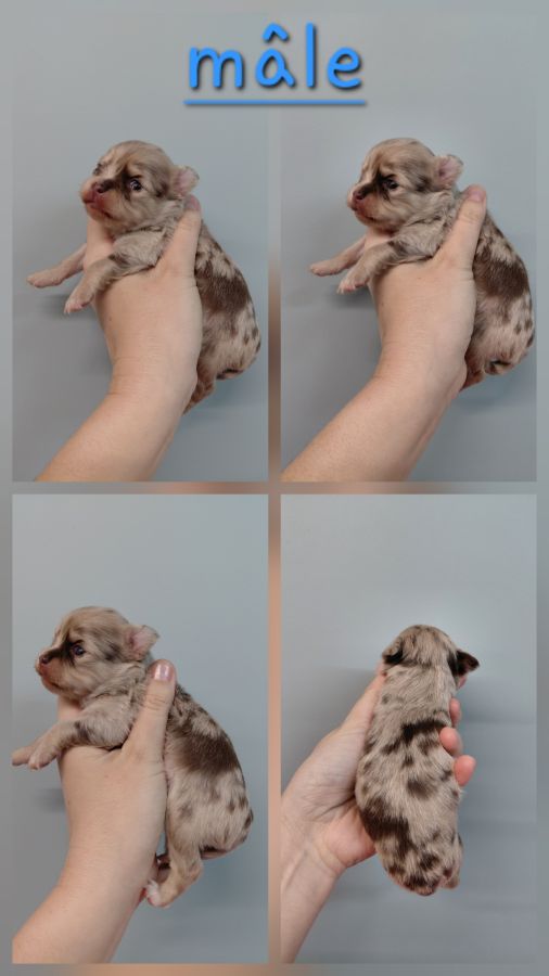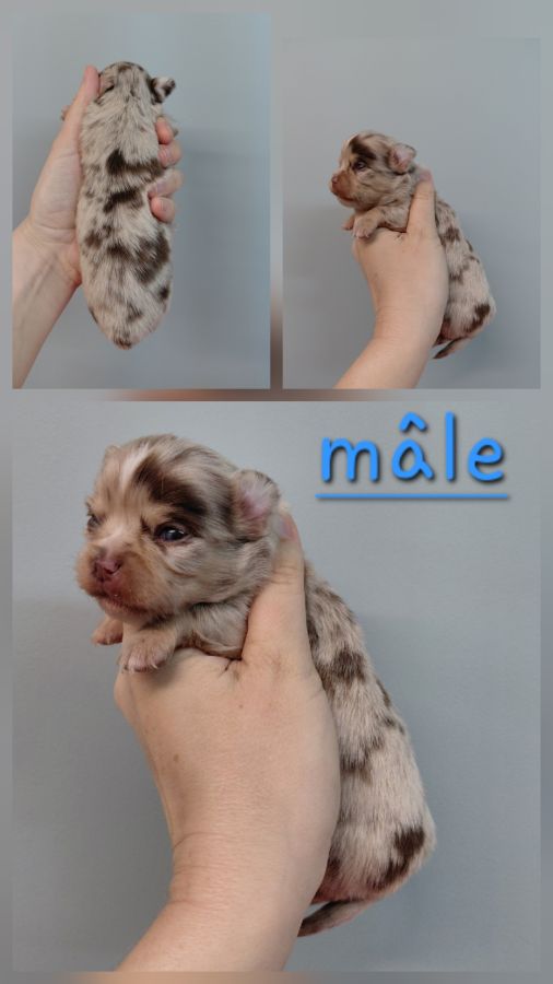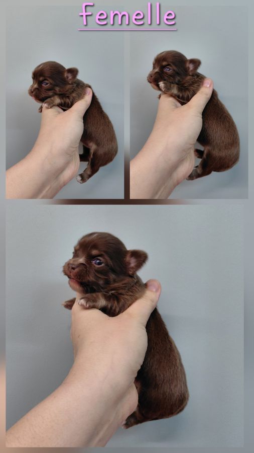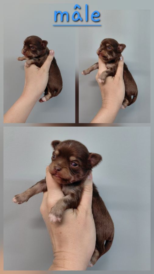 Bonjour, je vous propose 5 chiots chihuahua à poils longs de robe chocolat tricolore et merle chocolat. Ils sont magnifiques.