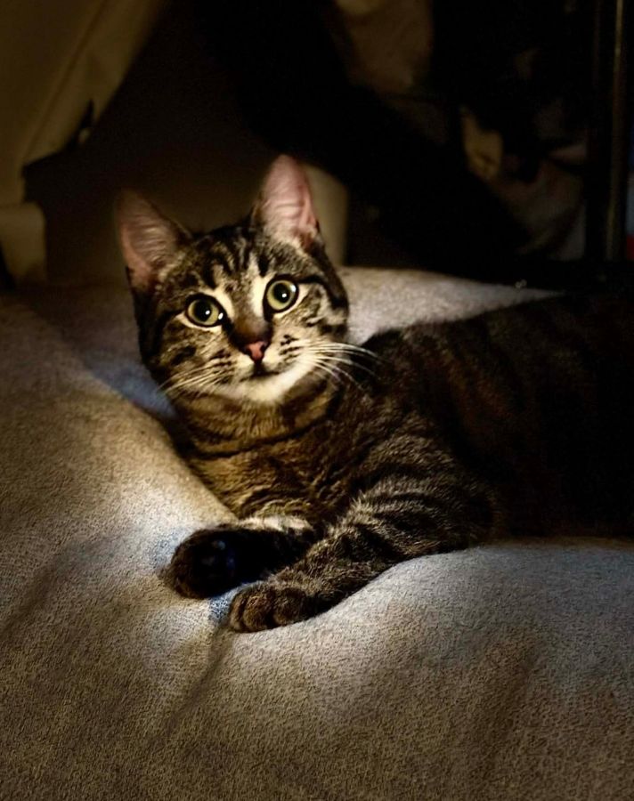 La demoiselle s'approche alors en donnant des coups de tête et en demandant des câlins. Fin gourmet, Tia ne résiste pas à l'odeur de la pizza ou des pates à la carbonara.