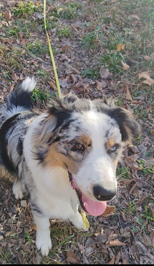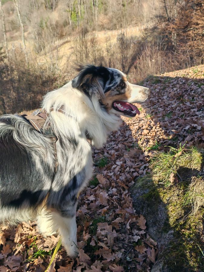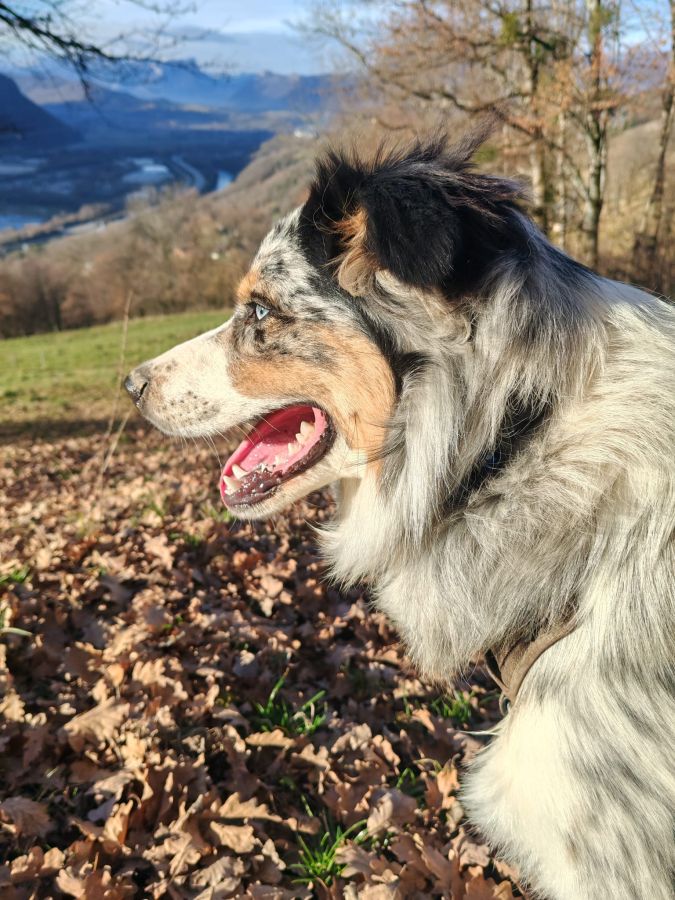 Aravis est un berger australien LOF de 9 mois et demi, bien dans ses pattes et pourtant il a connu 2 retours à l'élevage malgré une vigilance sur les familles. A son 2ème retour j'ai décidé de ne pas le remettre en famille pour le resociabiliser puisqu'il n'avait pas de sorties extérieures et pour qu'il retrouve une vie aimante et des balades quotidiennes. Depuis Aravis a retrouvé un équilibre, c'est un amour de chien qui aime les câlins, jouer, et qui sait se poser.