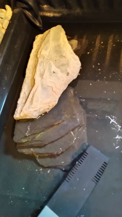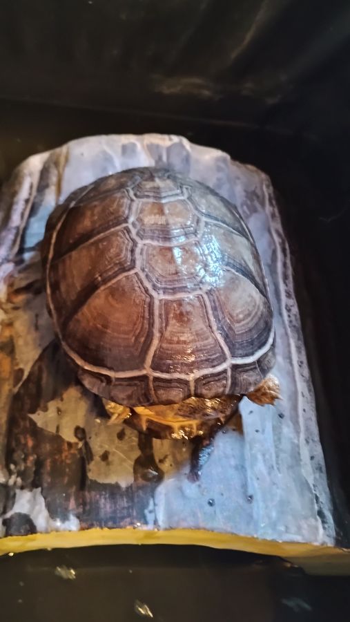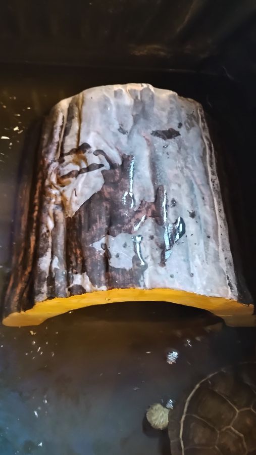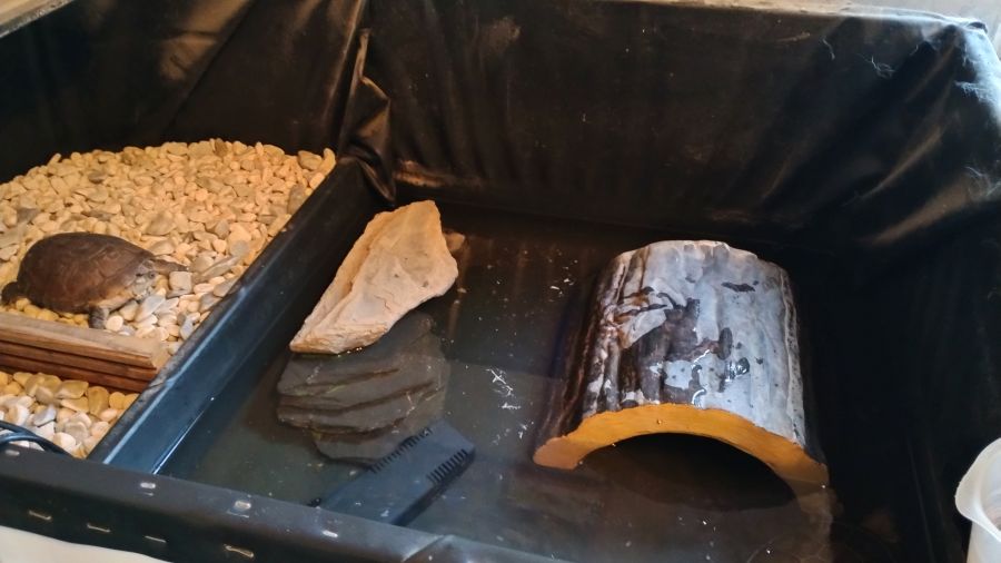 2 tortues pelomedusa avec habitat semis aquatique taille tortues 14 et 17 cm bac L 1,15 m l 76 cm pied 72 cm hauteur totale 1 m 12 avec décor pont pompe chauffage led nourriture