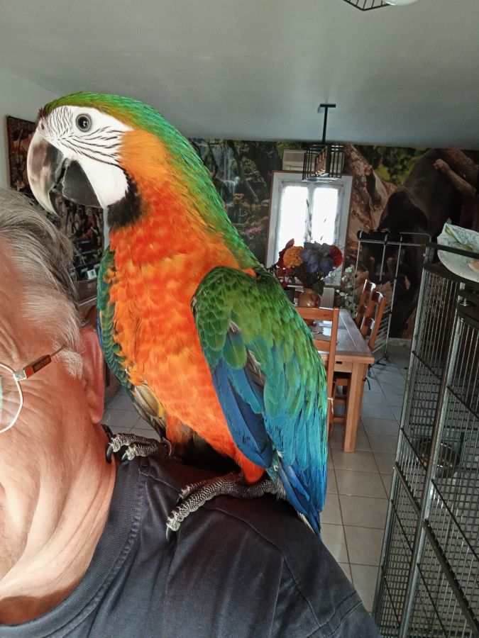 Cède jeune mâle ararauna de 2025, sexé ADN, parfaitement apprivoisé...