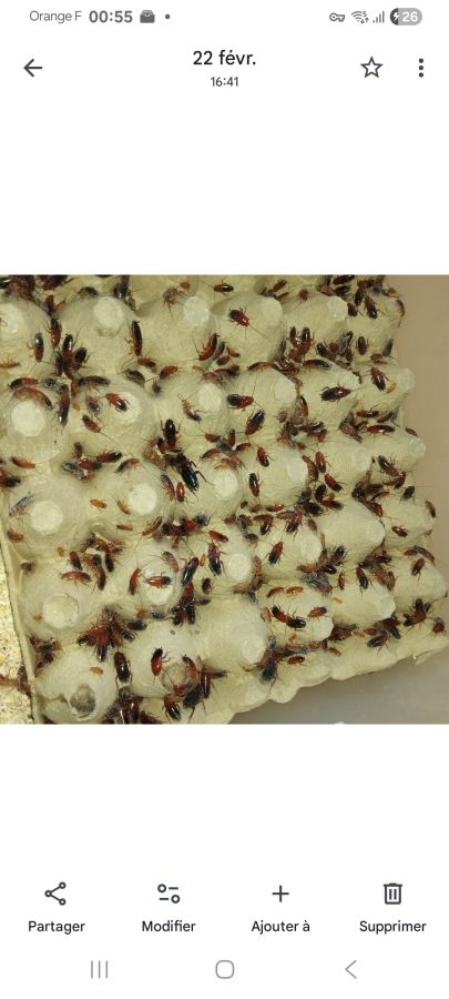 Bonjour je mets en ventes des blattes red runer pour nourrir fourmis mante religieuse lézard... de toute tailles 5 euros la boites plus frais de port envoi par le poste paiement pay pal contacter moi si sa vous interresse
