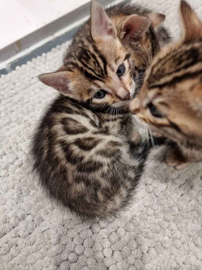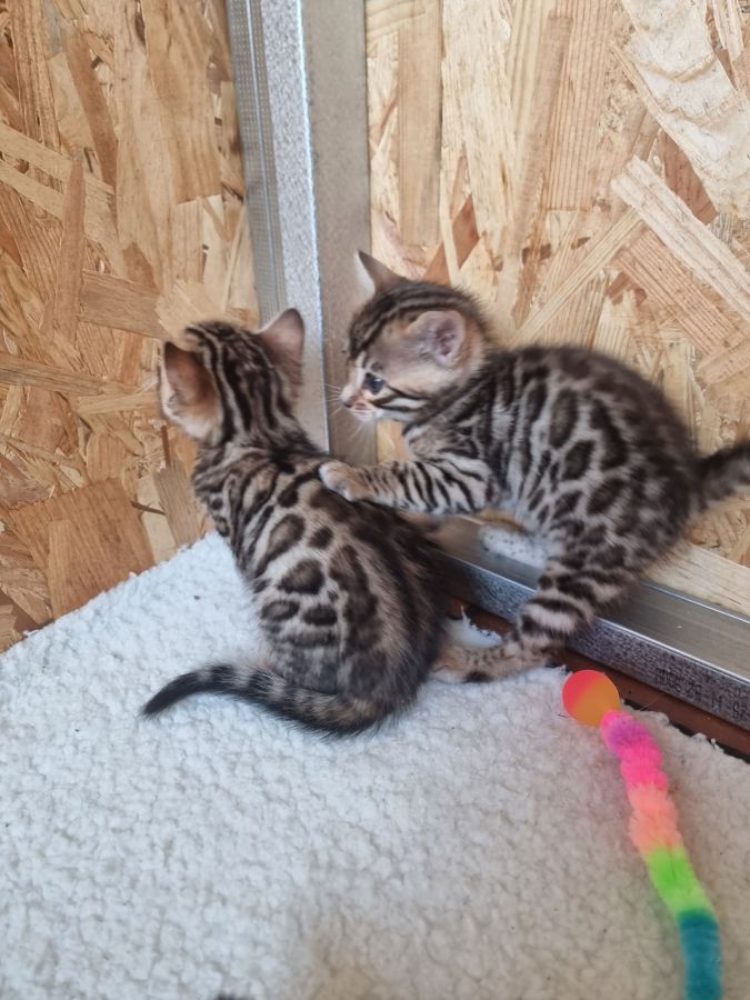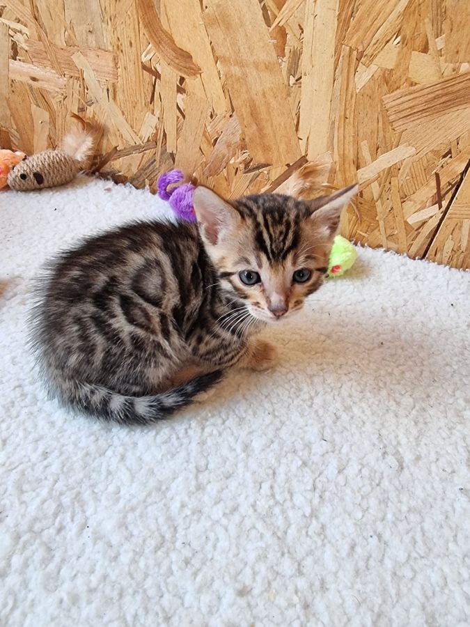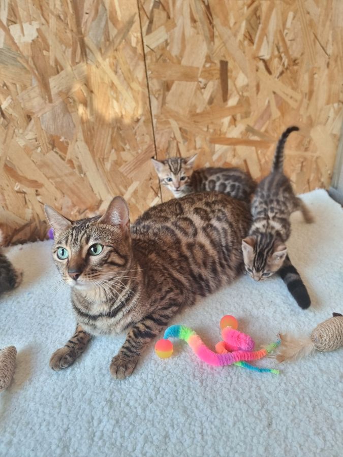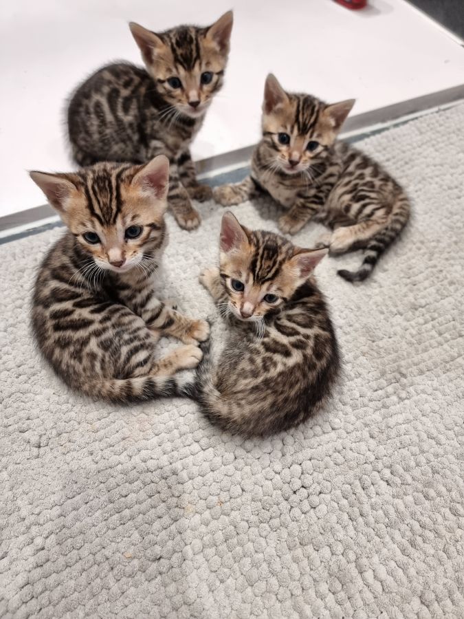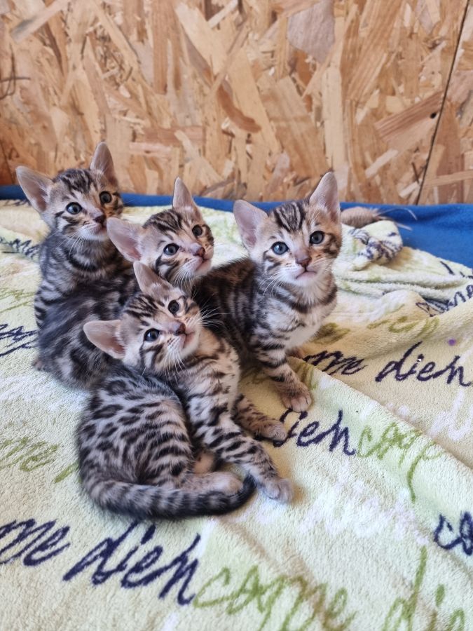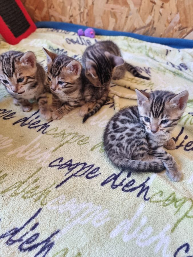 Mon petit élevage familial est heureux de vous proposer à la réservation 4 splendides chatons bengals avec deja de jolies rosettes bien dessinées