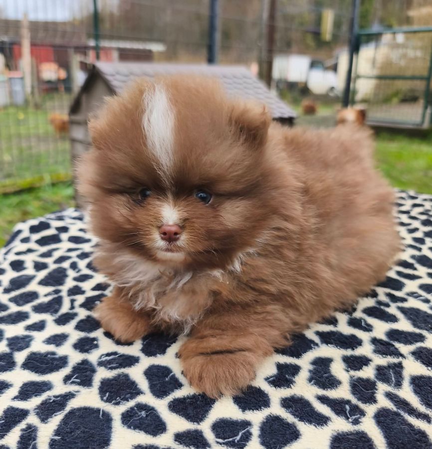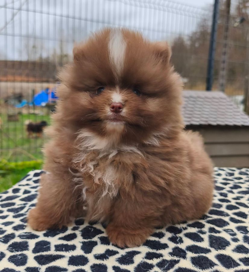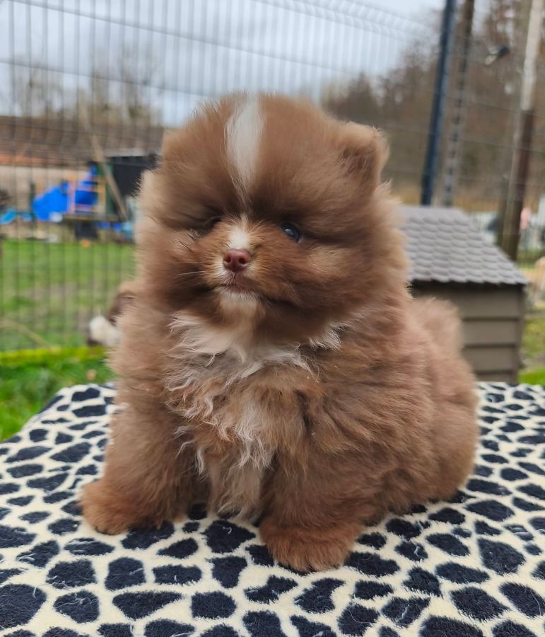Disponible à la réservation à l'élevage "Pomsky & spitz des terres de laferté" vous propose à la réservation un petit mâle spitz de couleur chocolat.