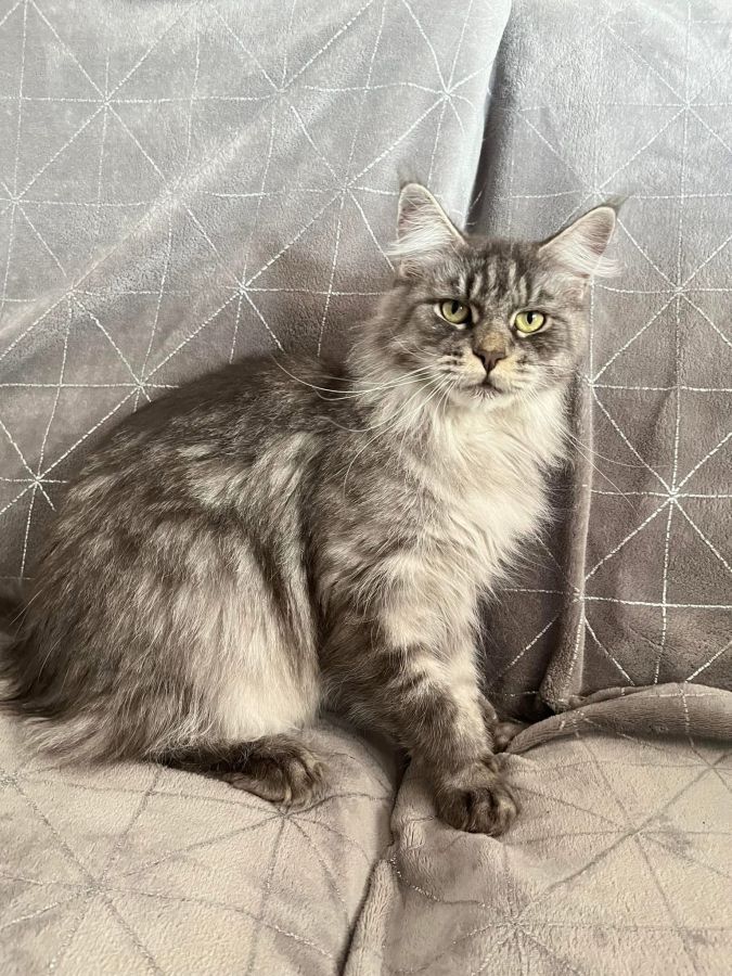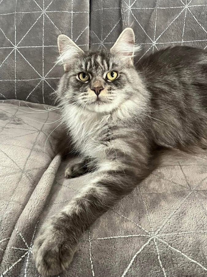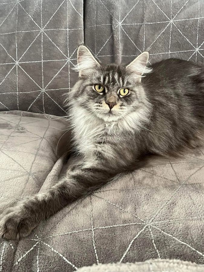 Sixtine est une magnifique femelle Maine coon LOOF de couleur Blue mackerel tabby polydactile aux 4 pattes, née le 27/03/2021 à placer pour une retraite heureuse dans une famille sérieuse et aimante.