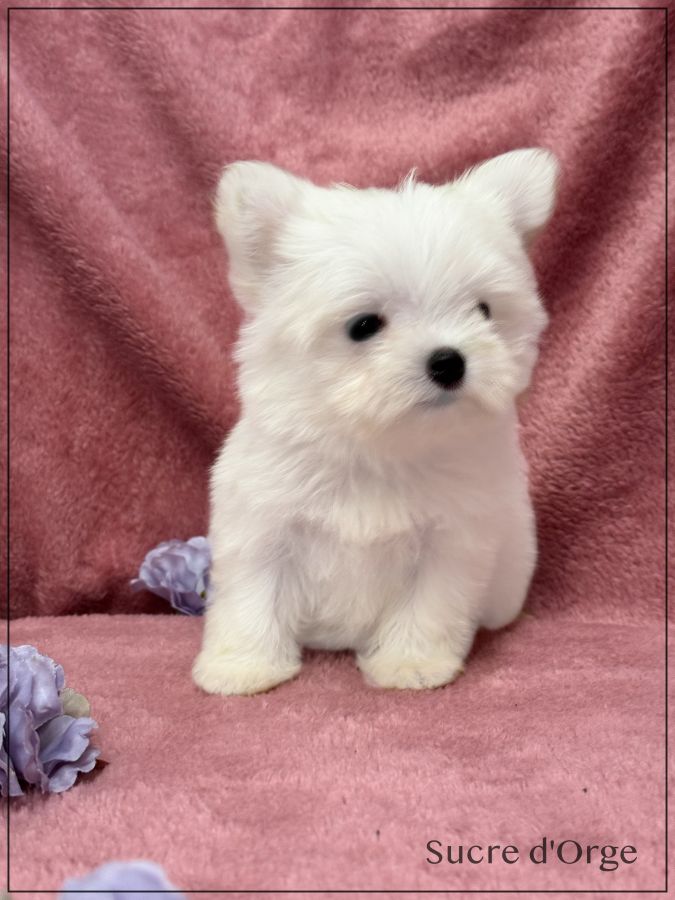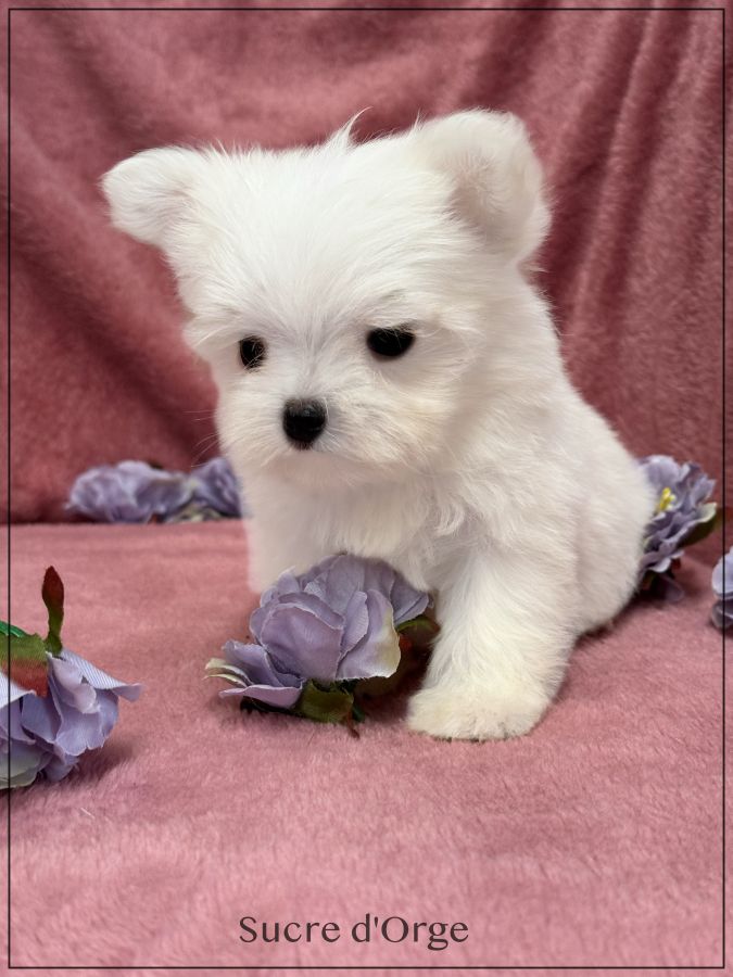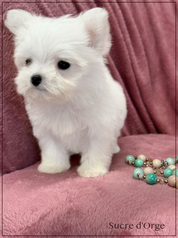 A réserver, Sucre d'Orge, superbe femelle type Bichon Maltais petit modèle, issue de deux parents Lof et confirmés. Sucre d ' Orge est née le 18 décembre dernier ,issue d’une portée de 3 bébés. Disponible à compter de fin mars. Magnifique chiot ,petit nez court et tête ronde , fourrure très fournie blanche lisse sans boucle ,Sucre d'Orge possède une excellente pigmentation. Son papa pèse 2.4 kgs et sa maman 2,5 kgs ,tous deux avec de superbes origines. Sucre d'Orge est vendue pucée , vaccinée ,certificat du vétérinaire , mutuelle offerte 2 mois, garantie jusqu’à l’âge d’un an en cas de maladie ou malformation héréditaire ou congénitale. Elle est élevée dans un univers familial et fera le bonheur d’une famille .Nous sommes proches de Lyon . Facilités de paiement possible en 4 fois par CB. Suivi et conseils après la vente