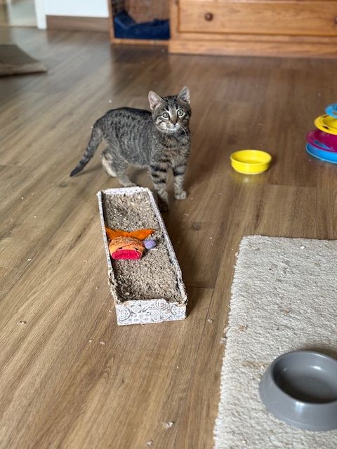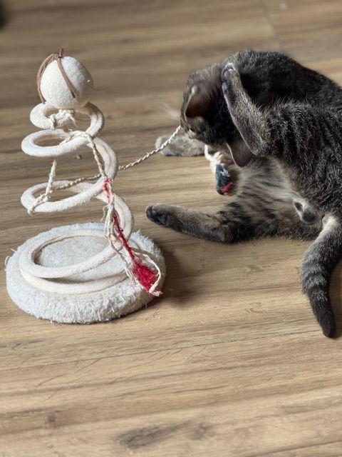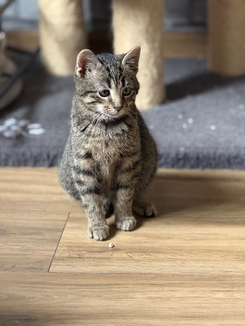 Aujourd’hui, Loulou est un jeune chaton de 4 mois, tigré comme on les aime, débordant de vie et d’énergie.
